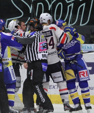 02:20 - Lakos naskočil na led a rozhodčí pískal nesmyslný ofsajd. Sudí svou chybu uznal, a tak se vhazovalo ve středovém kruhu.