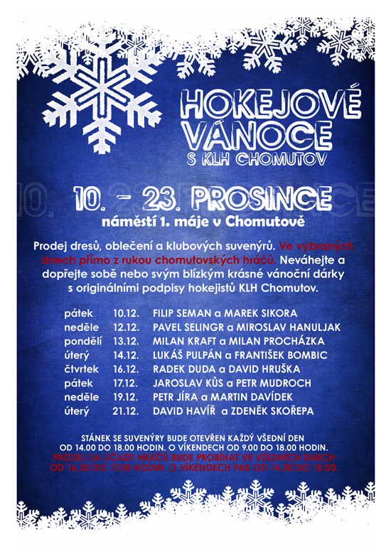 Speciální vánoční akce bude probíhat celkem třináct dní na hlavním chomutovském náměstí. Stánek s dresy, oblečením a klubovými suvenýry najdete v horní části náměstí nedaleko umělé ledové plochy.