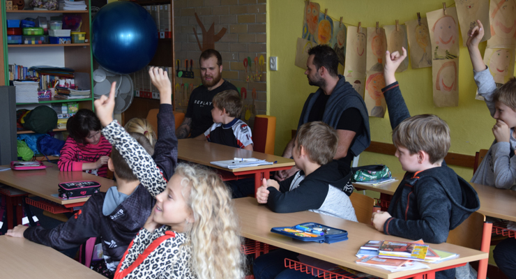 Oba aktuální marodi mimo jiné prozradili zatím nejhorší zranění kariéry a zhruba po hodině se chystali školu opustit, jenže odchod se protáhl, neboť jim cestu zatarasily děti lačnící po podpisech. „Snad se na nás rodiče nebudou zlobit, až uvidí ruce dětí,“ usmívá se Martin Rýgl v narážce na autogramy přímo na kůži.