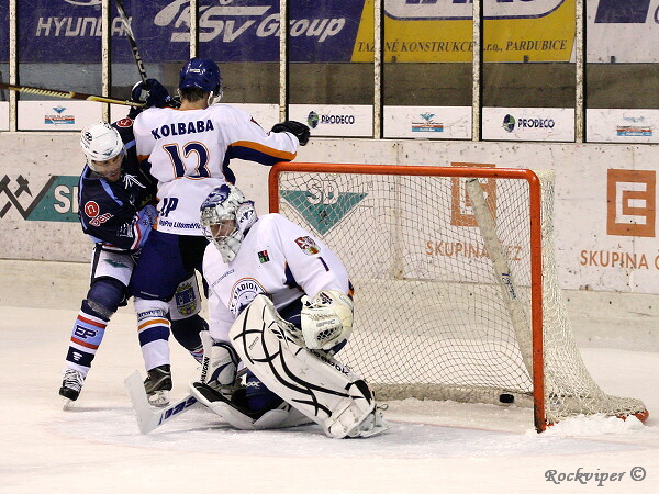 Hanuljak pozoruje kotouč v jeho těsně blízkosti, propustit jej však nedovolila chomutovská dvojice Radek Duda a Jakub Grof. | autor: Zdeněk Špinka