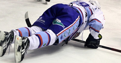Radek Duda již nic nevymyslí. Hokejku mu přerazil hostující Malena, za což se hlavní sudí chystá vylučovat. | autor: Zdeněk Špinka