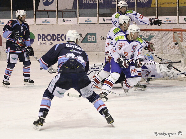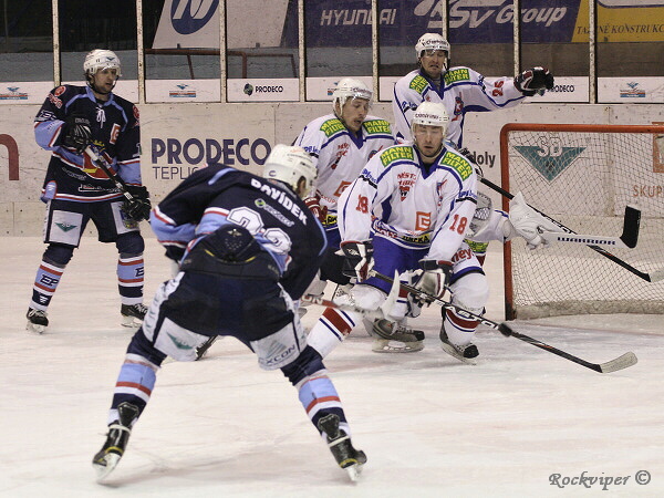 Marná snaha hostí zastavit střelu Martina Davídka, která znamenala branku na 3:0.