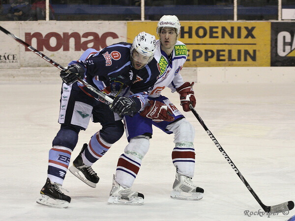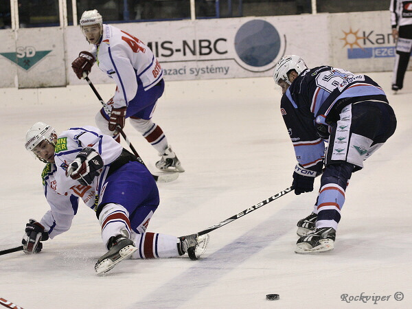 Marek Sikora se snaží něco vymyslet, brání mu Ondřej Malinský, který ještě vloni za Chomutov hrál.