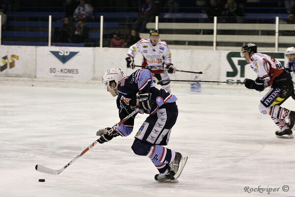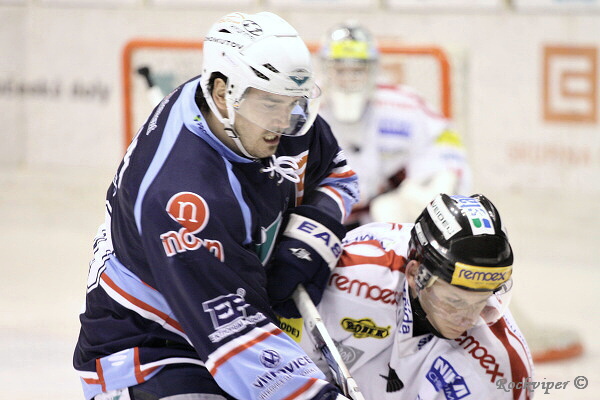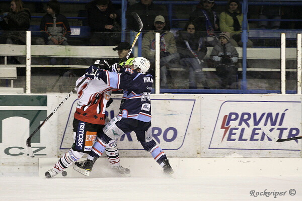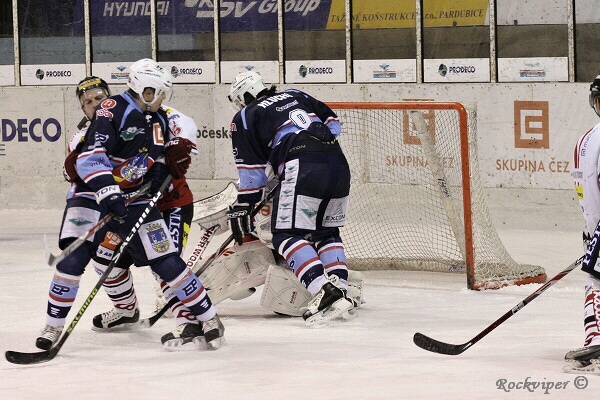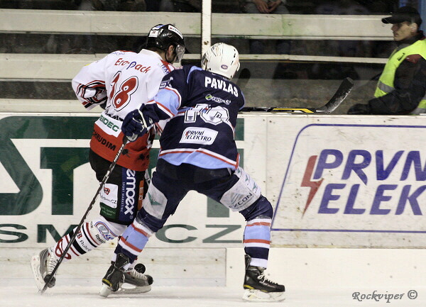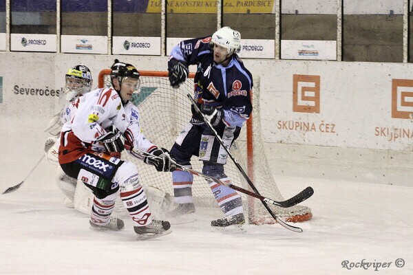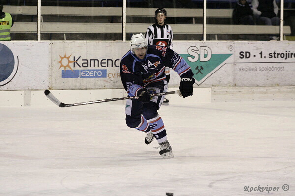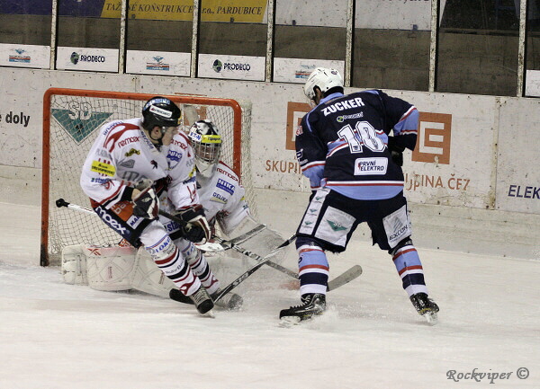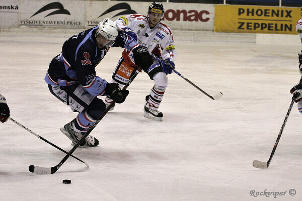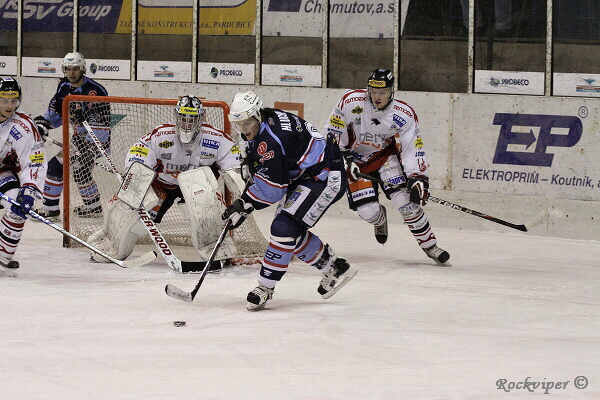Jaroslav Kůs sleduje hru, hostující obránci naopak nemohou z domácího útočníka spustit oči.