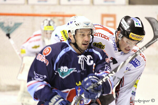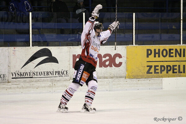 Hostující kapitán Král právě proměnil střelou pod vyrážečku trestné střílení v prodloužení.