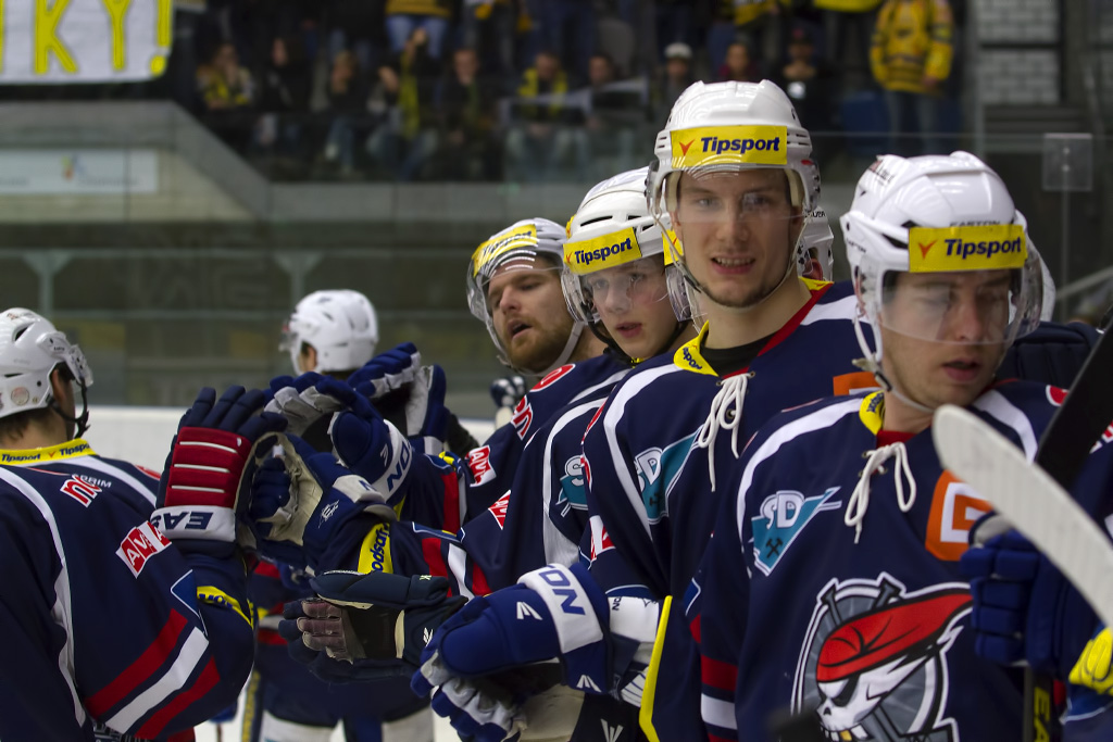 Autor vítězného gólu v derby s Litvínovem odjíždí oslavit svou trefu se spoluhráči na střídačce