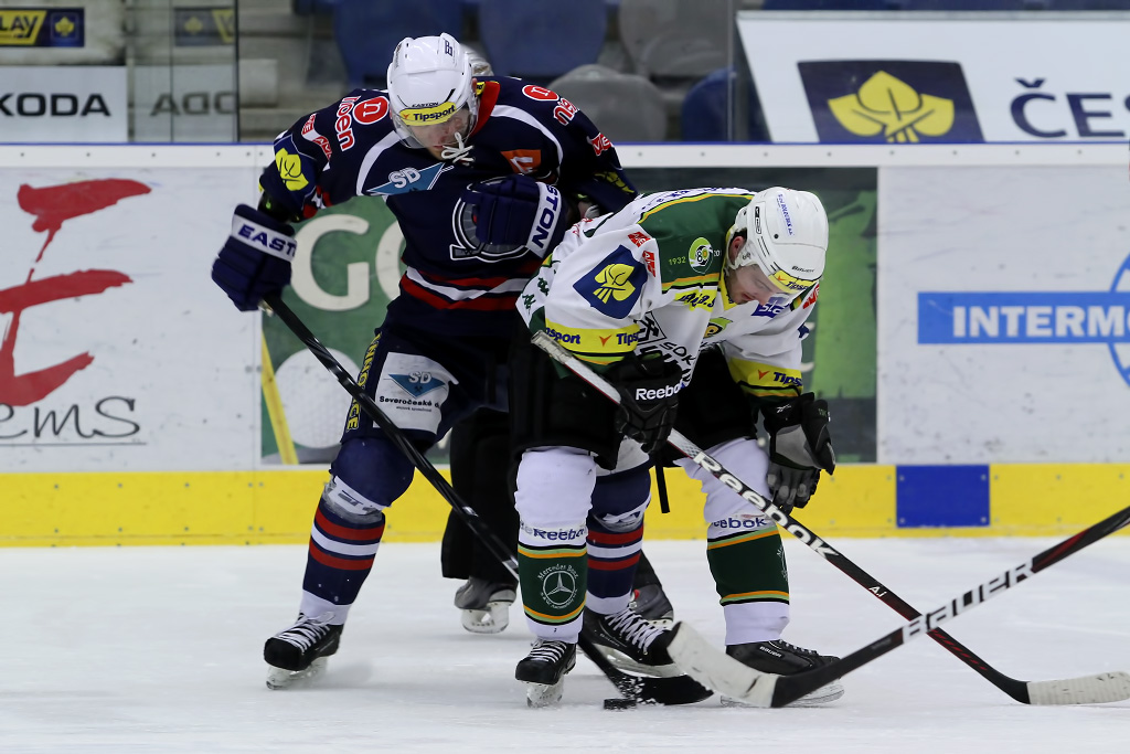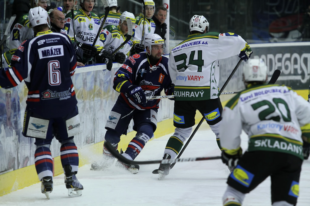 Štěpán Hřebejk atakuje jednoho z karlovarských hokejistů