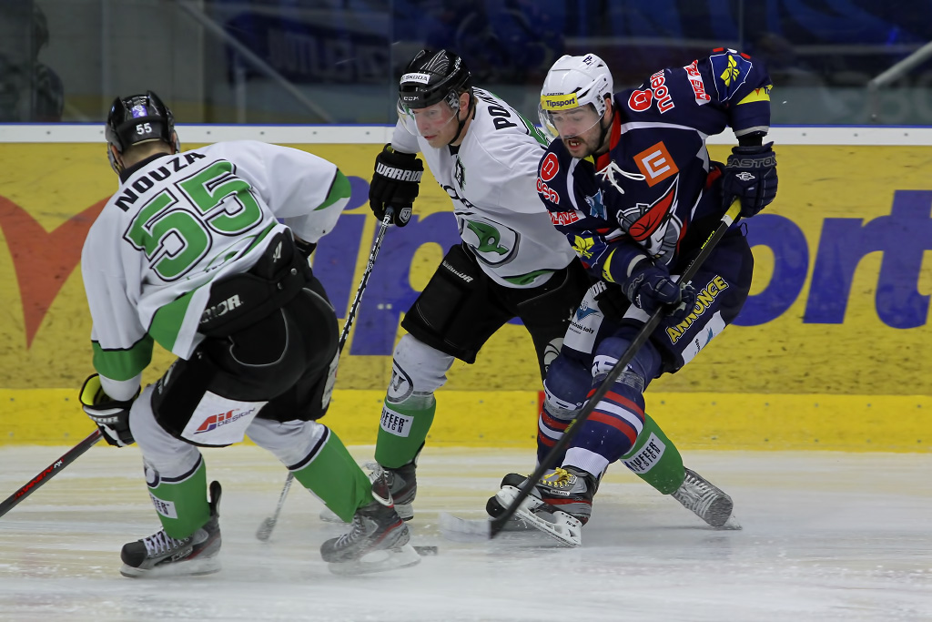 Marek Sikora, autor vítězného gólu a jedné asistence, se pokouší projetí mezi Davidem Pojkarem a Tomášem Nouzou