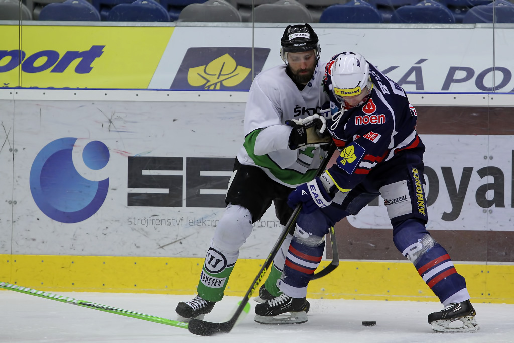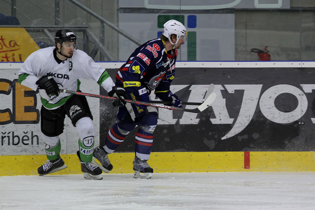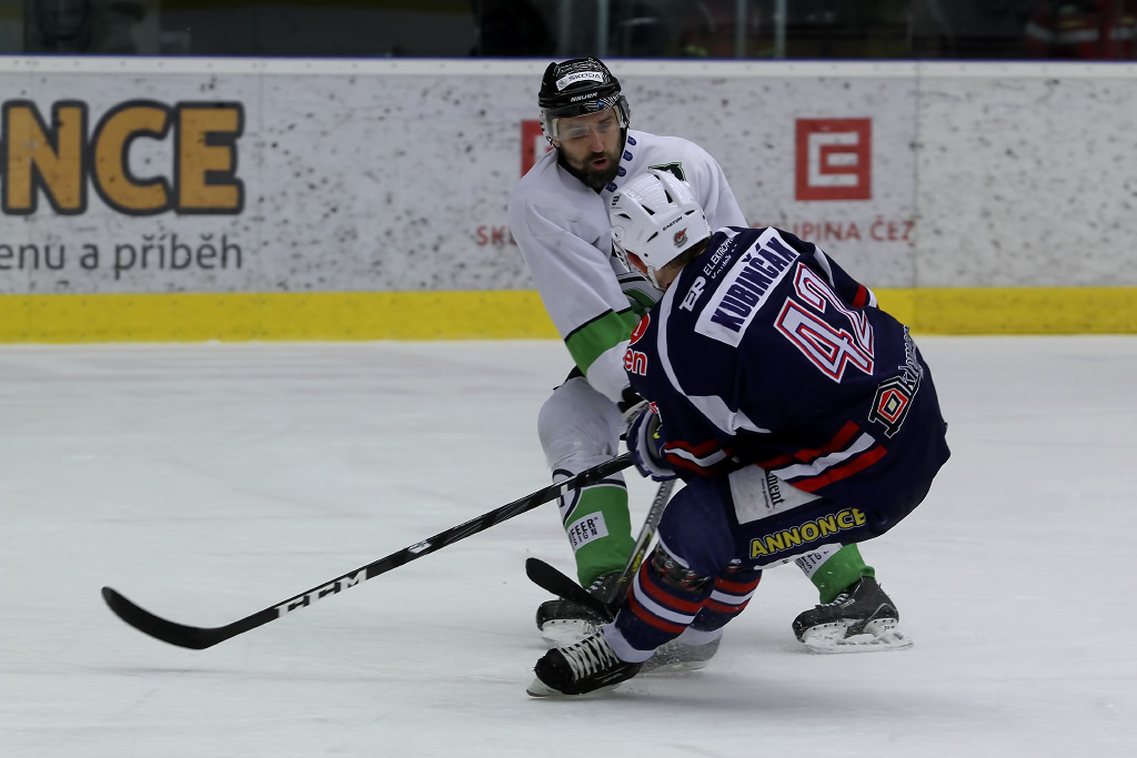 Jaroslav Kůs bojuje před mladoboleslavskou brankou, aby získal zpět puk