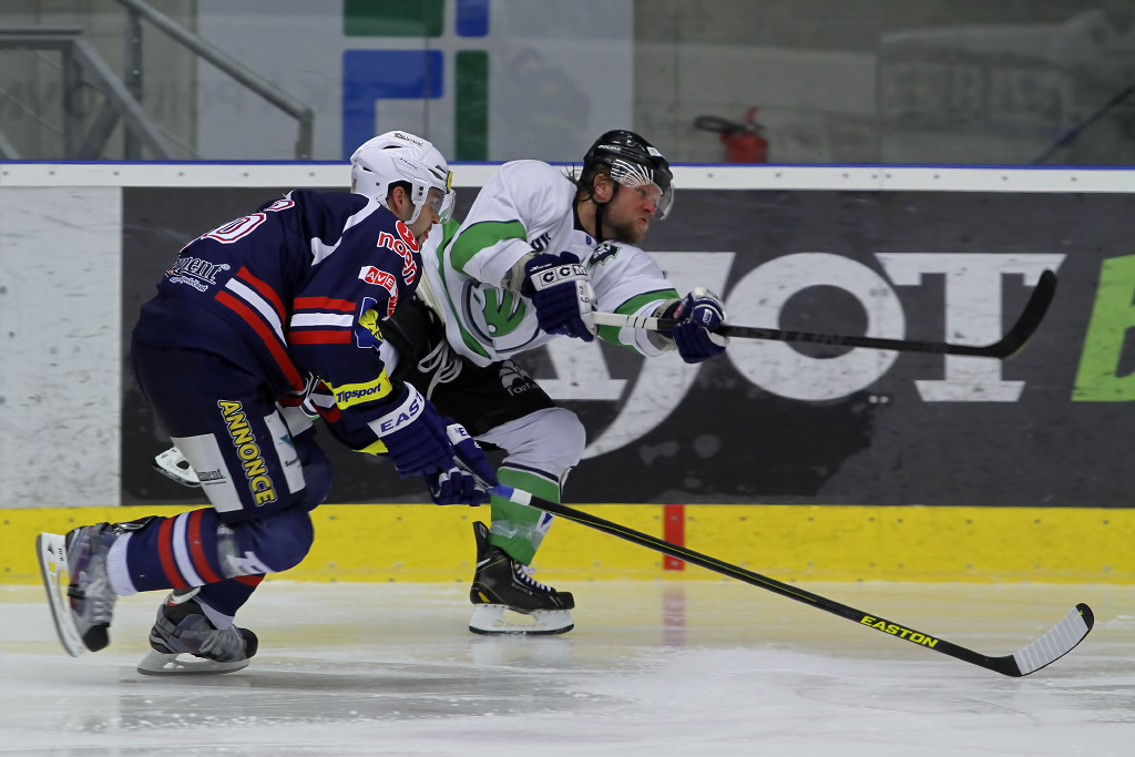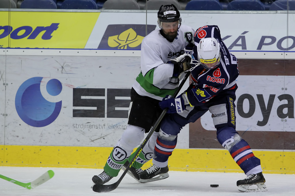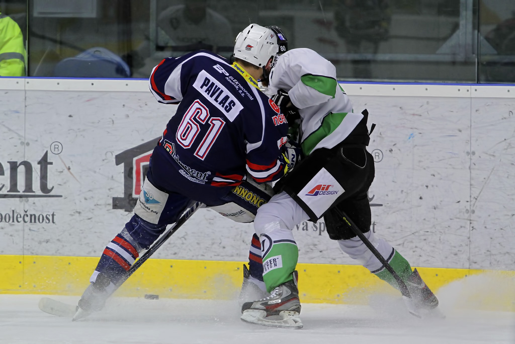 Michal Důras a Karel Hromas bojují o puk v obranném pásmu Mladé Boleslavi