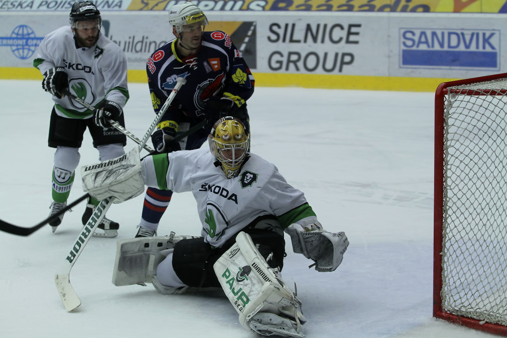 David Hruška operuje před Romanem Willem, jehož nepřekonal, ale asistencí se podílel na třetím zásahu Pirátů