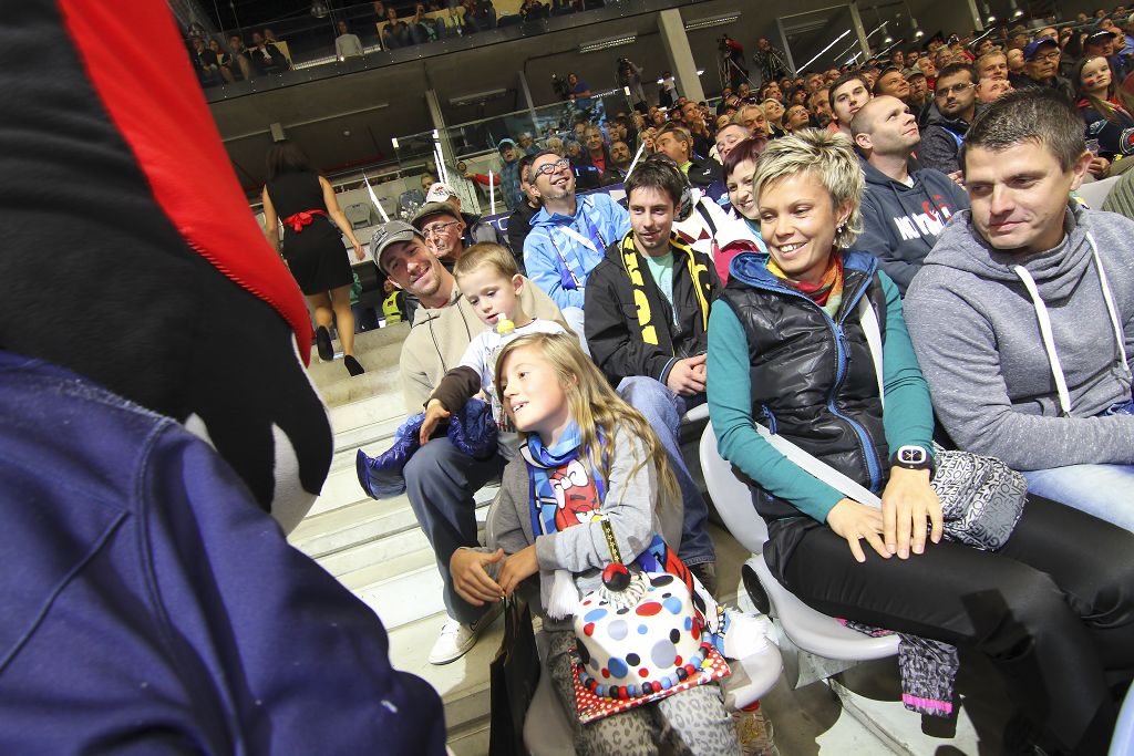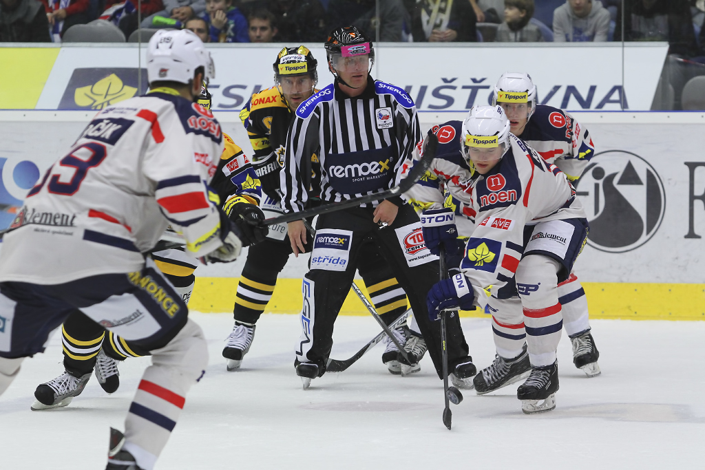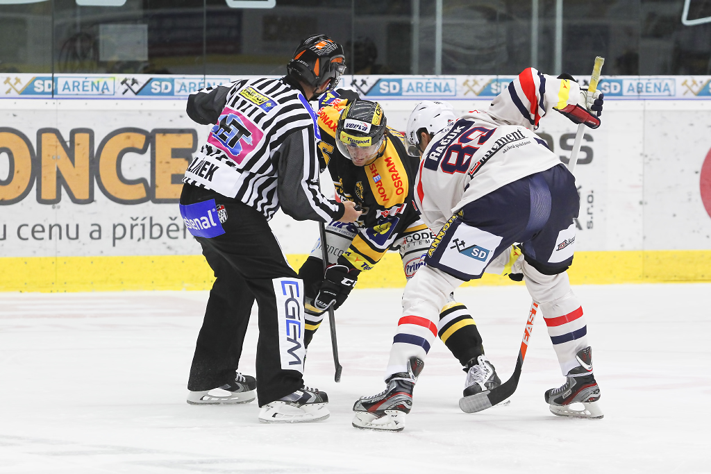 Finský rozhodčí Anssi Salonen vhazuje úvodní buly derby dvou velkých regionálních rivalů