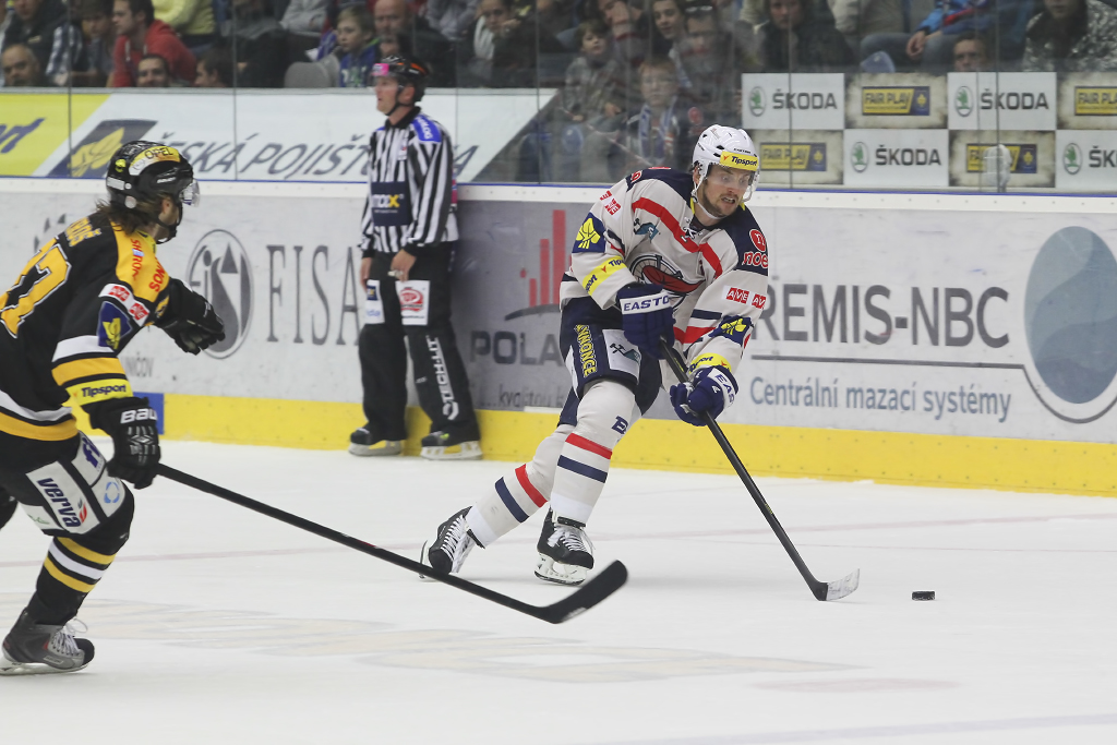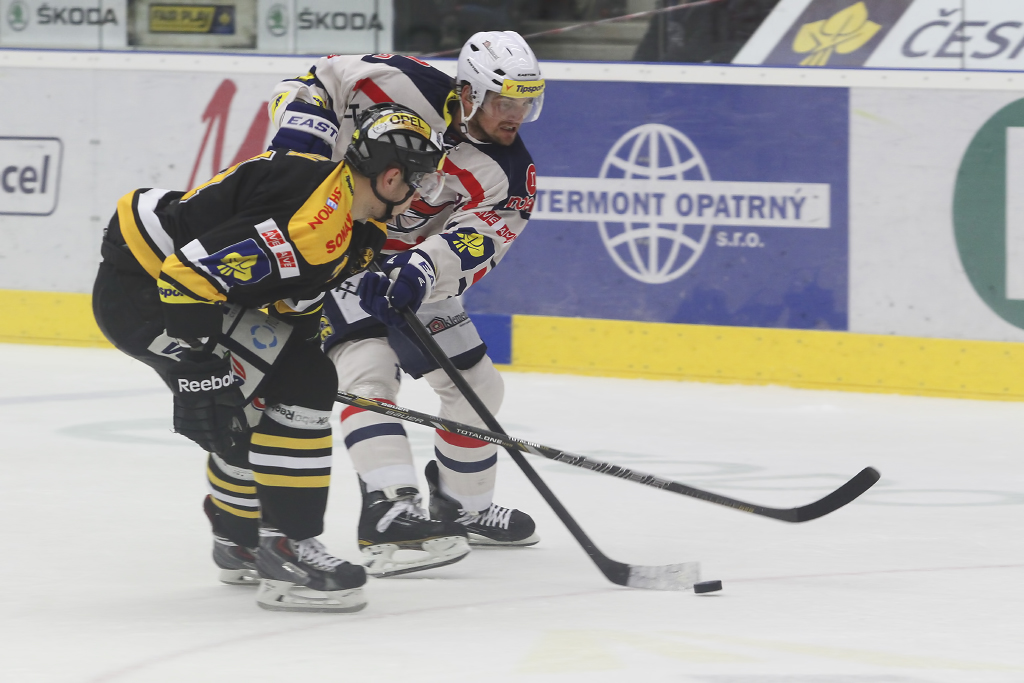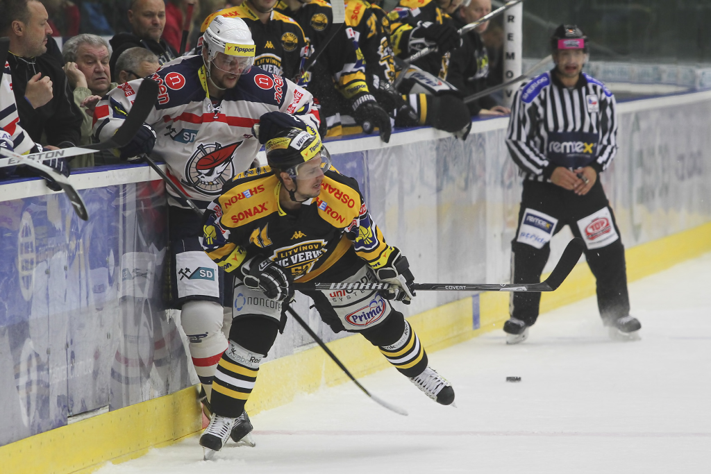 Obránce Libor Šulák dostává puk před litvínovskou branku