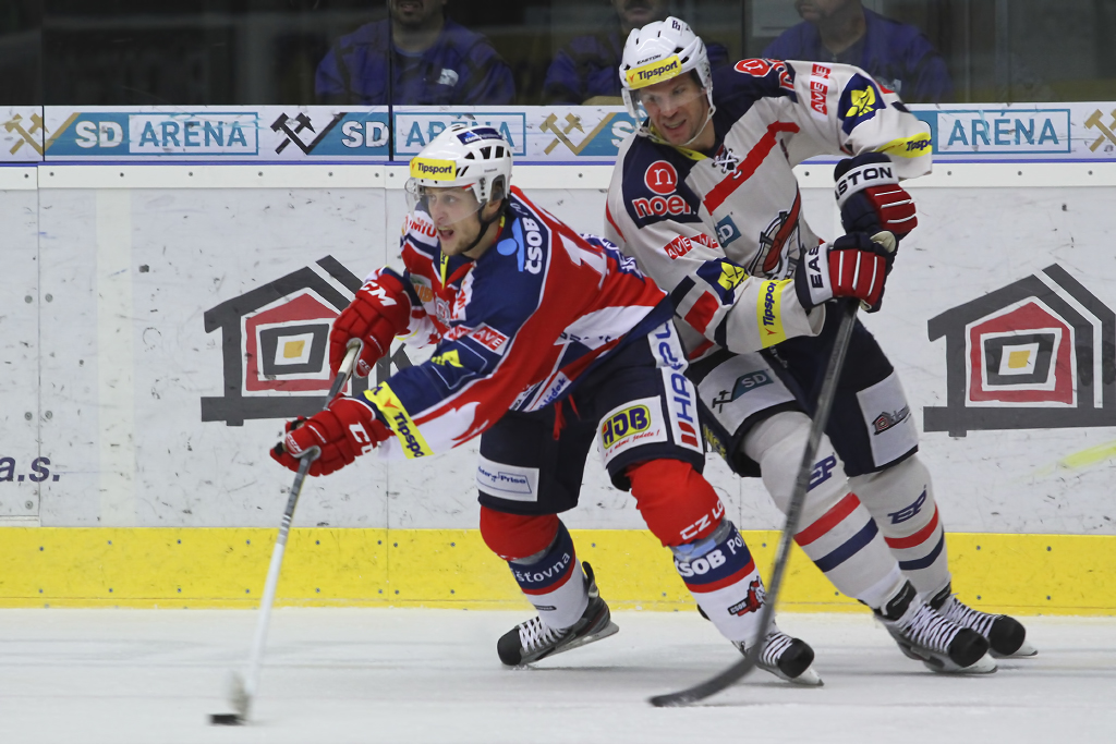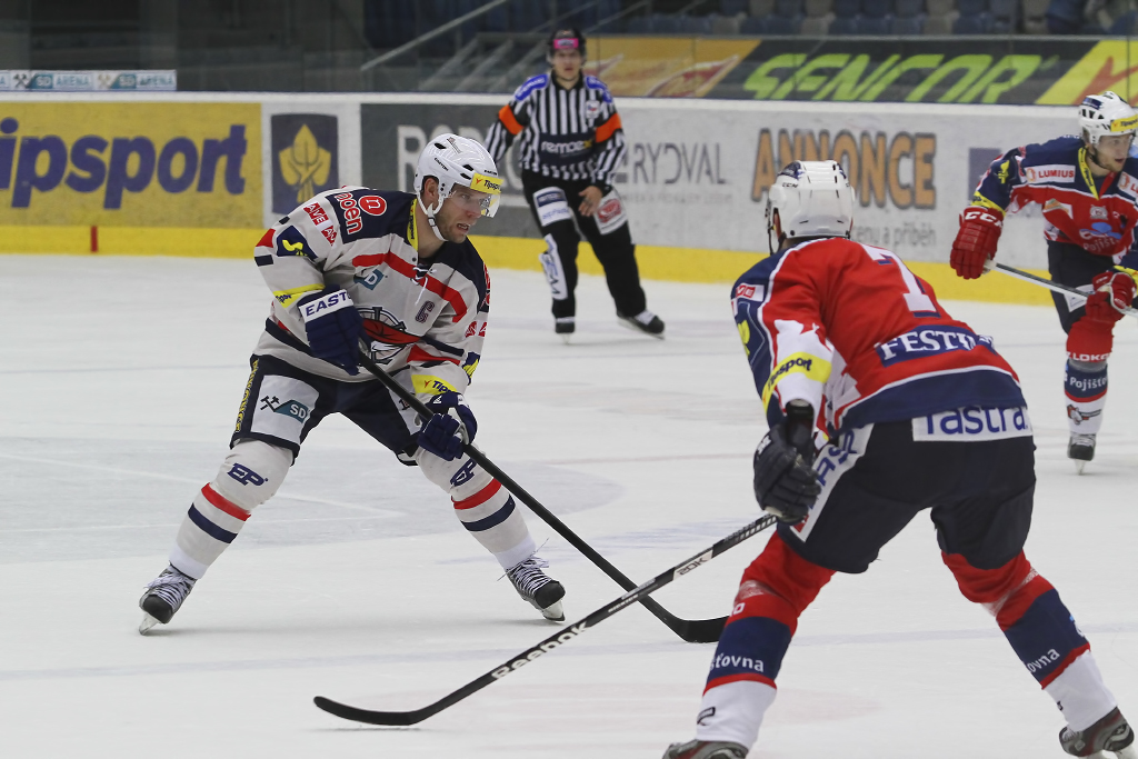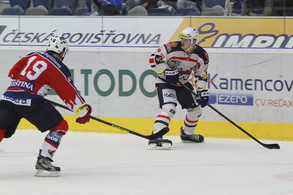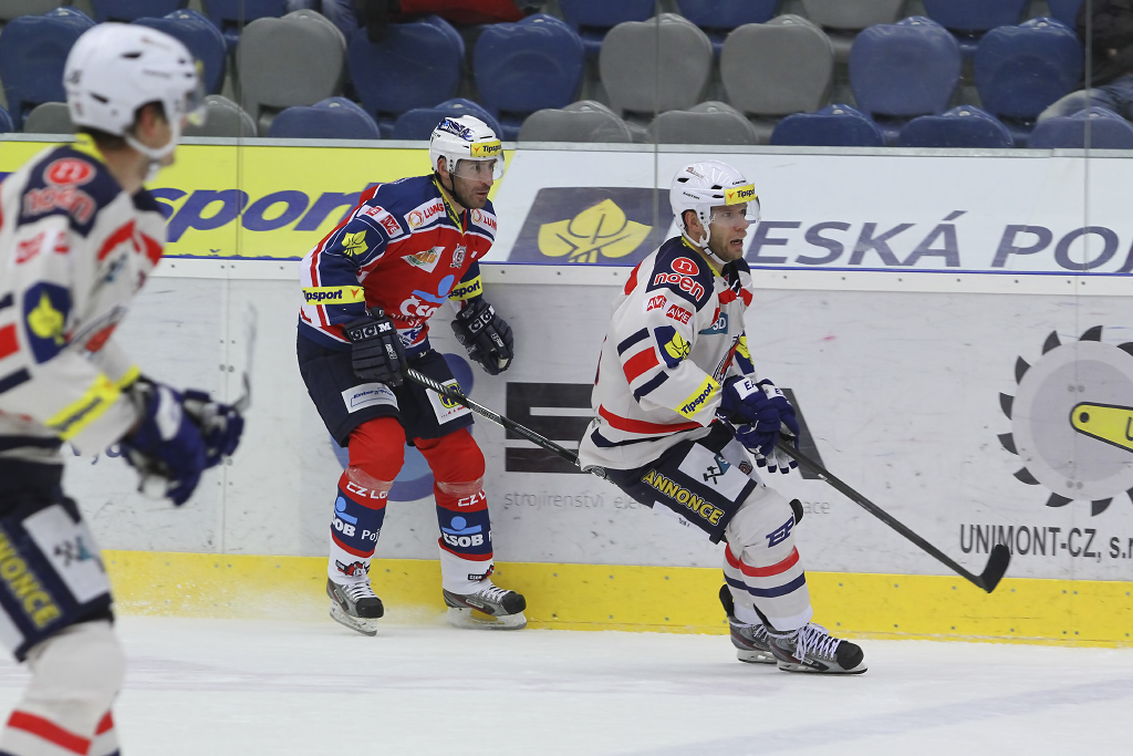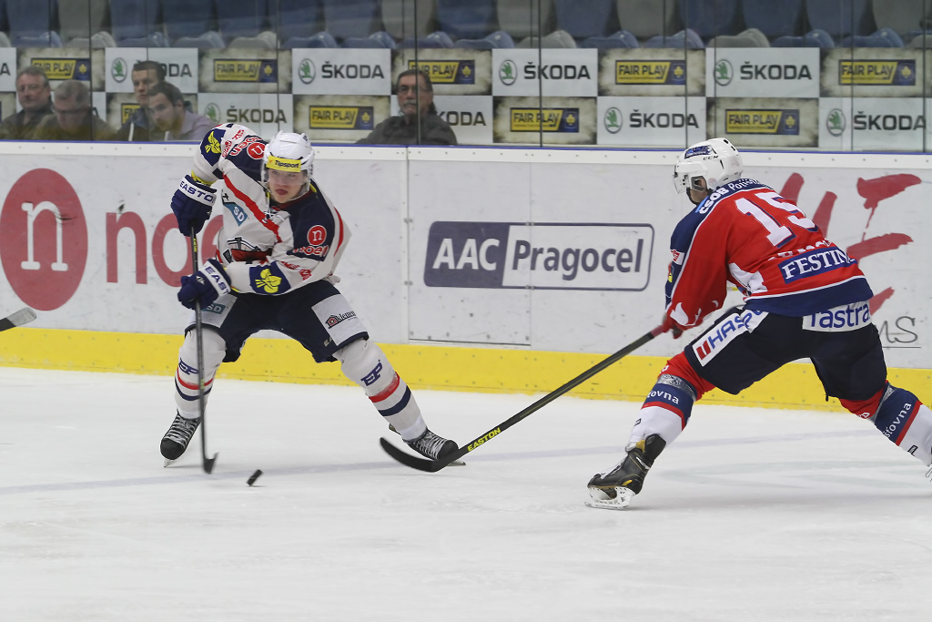 David Kämpf vjíždí do útočného pásma Pardubic pod bedlivým dohledem Blaže Gregorce