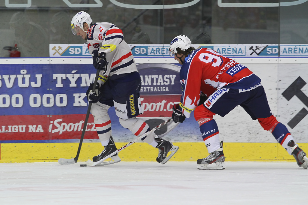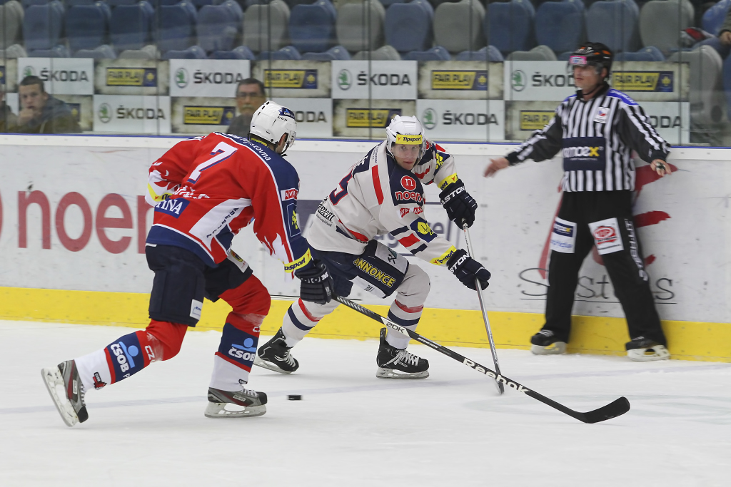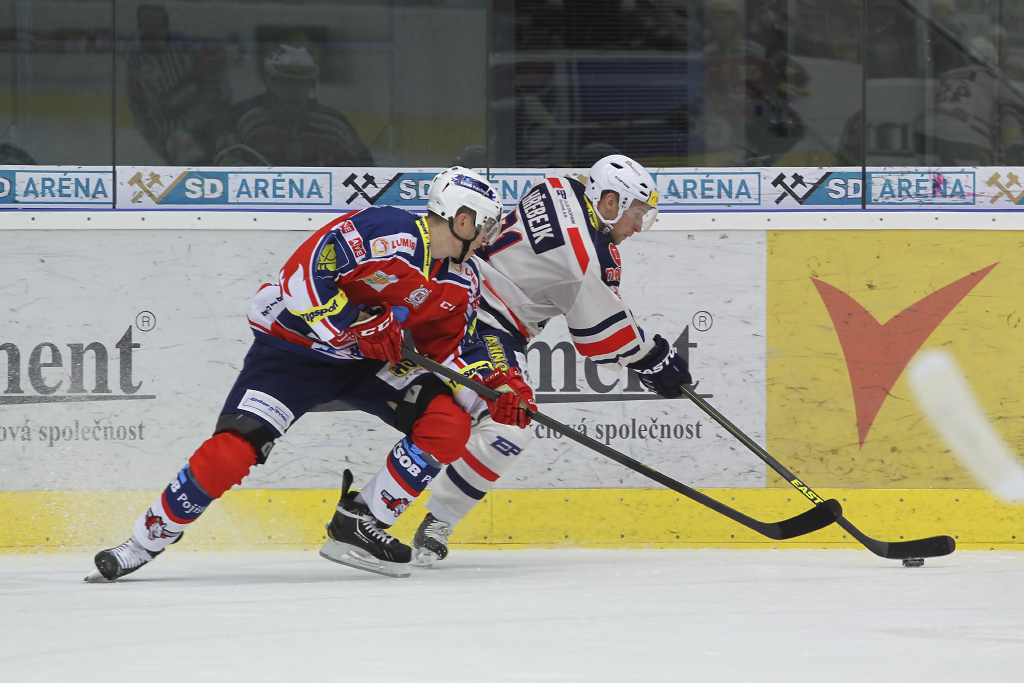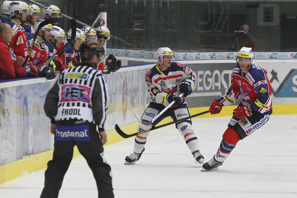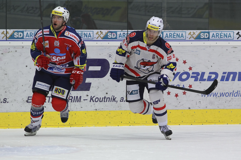 David Kämpf vjíždí do útočného pásma Pardubic pod bedlivým dohledem Blaže Gregorce