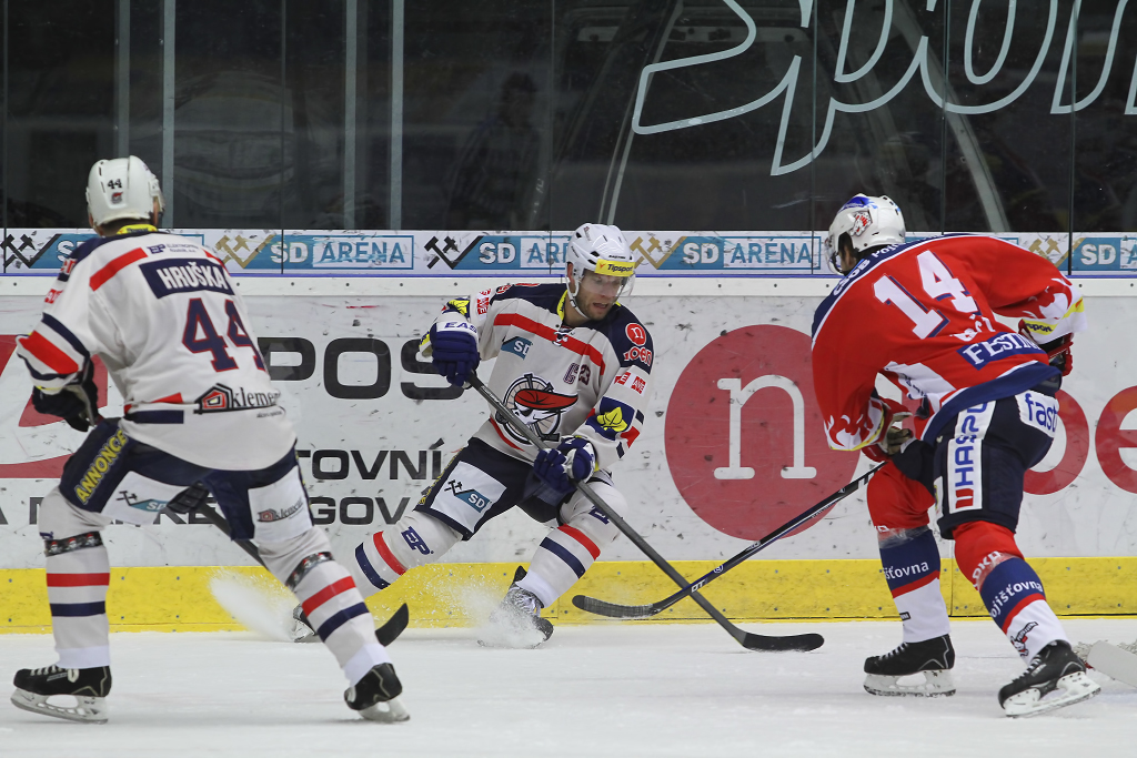 Štěpán Hřebejk se snaží probít mezi dvěma pardubickými hráči