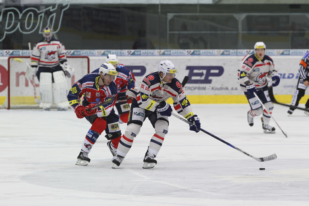 Tomáš Malec na útočném výletě u pardubické branky, jednoho z bránících hráčů odstavuje Marek Račuk