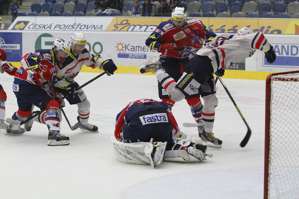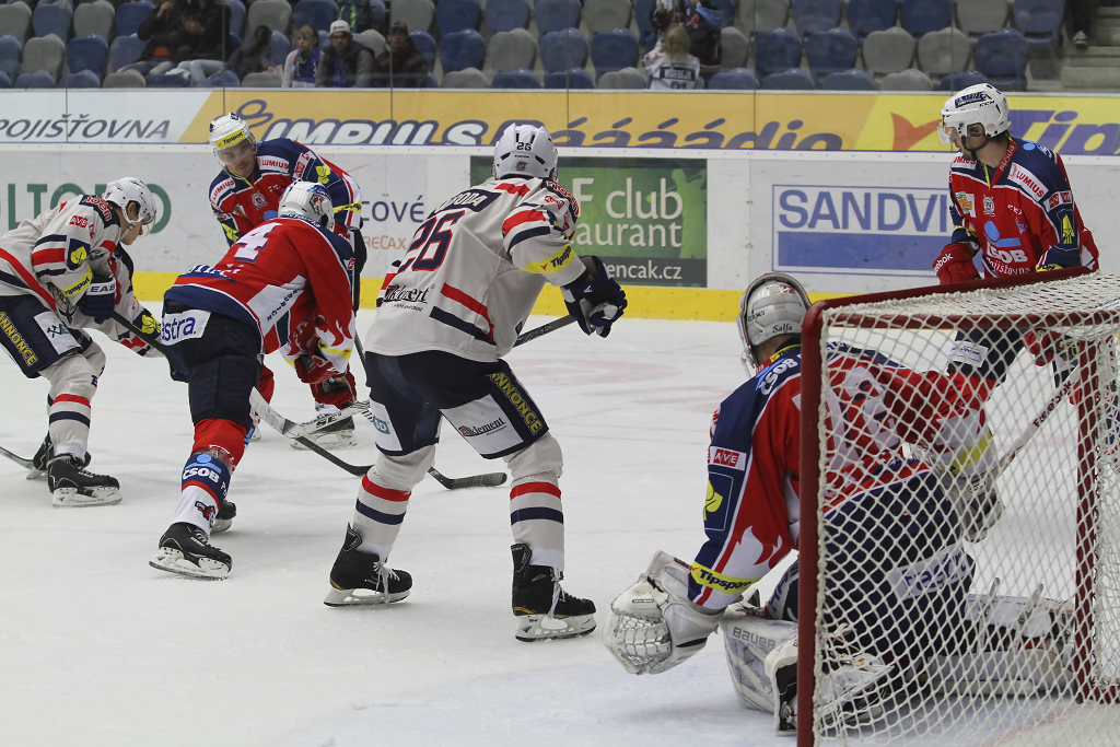 Tomáš Divíšek se v obležení přesily pardubických hráčů k dorážce nedostal