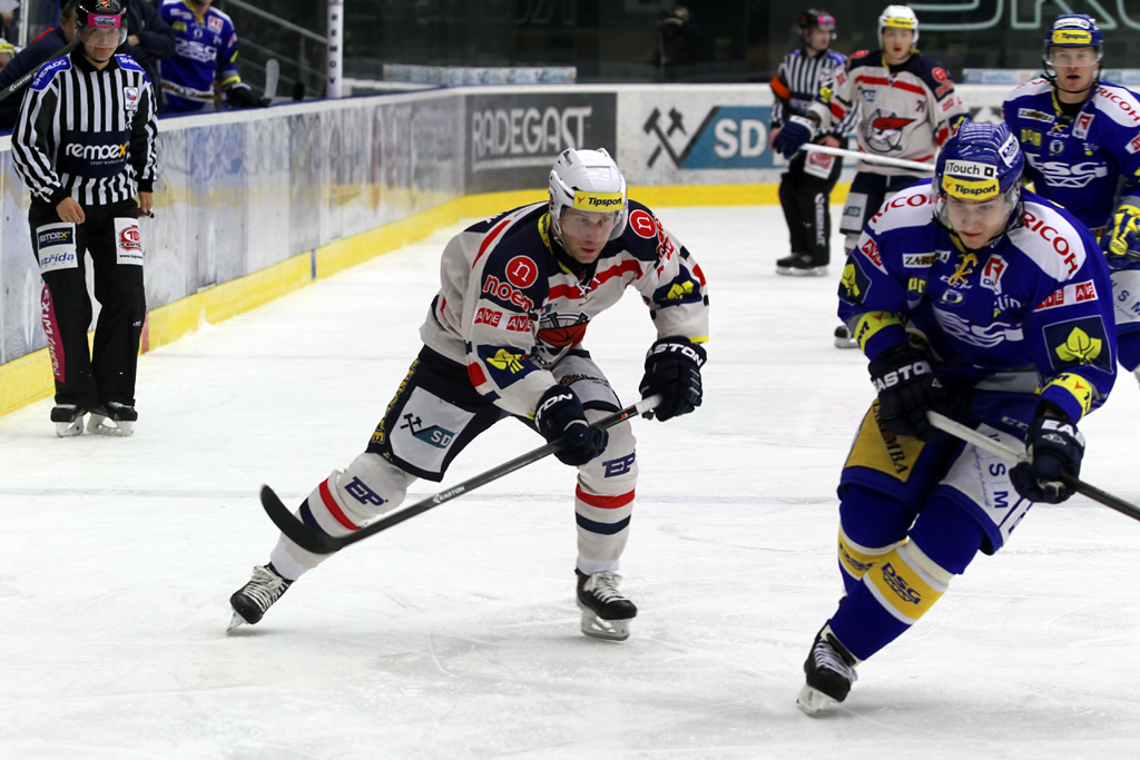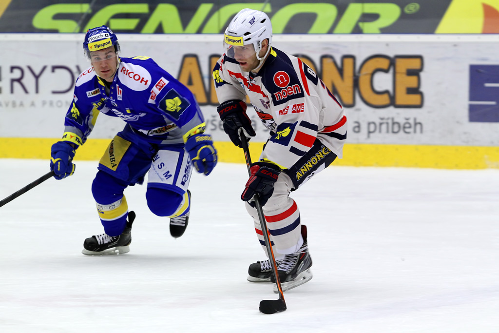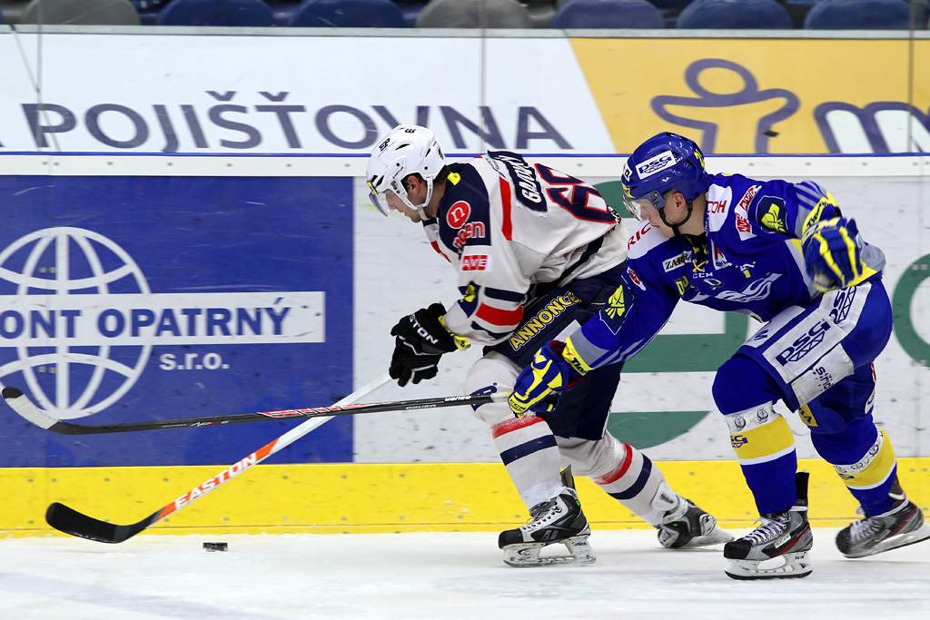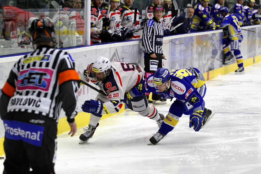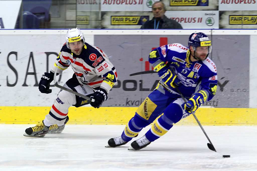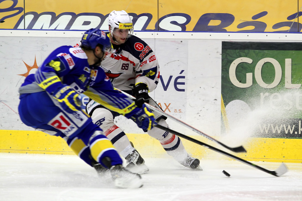 Ľuboš Bartečko si chrání kotouč před před dotírajícím bránícím hráčem Zlína