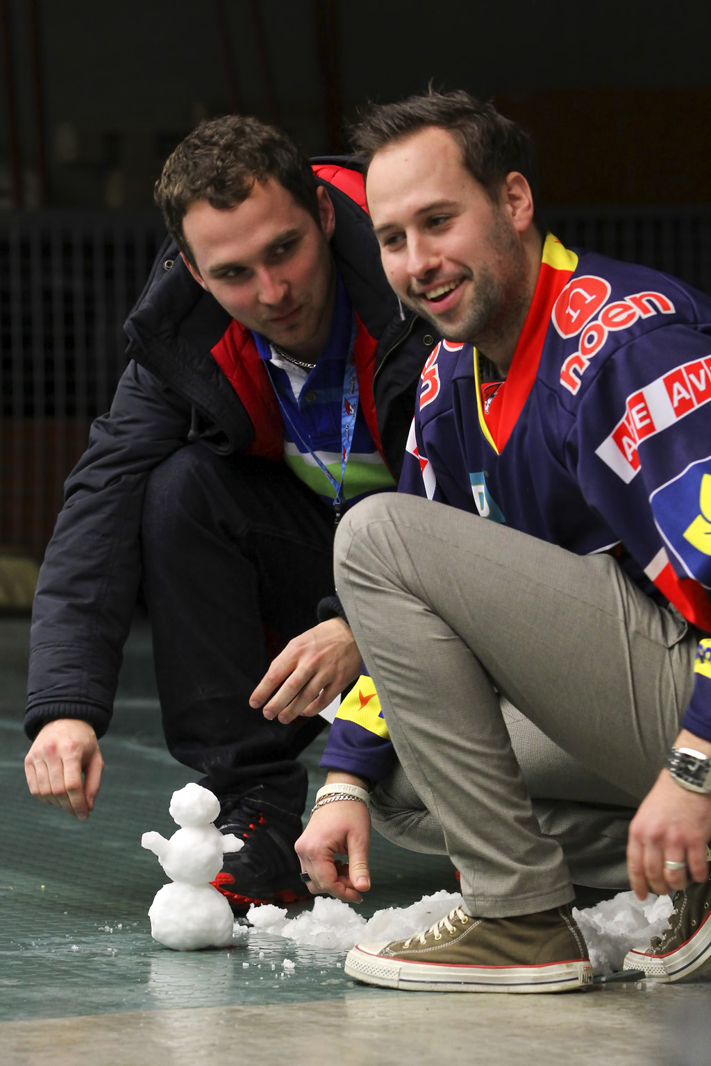 Moderátor zápasů Lukáš Budai a člen marketingového oddělení Jakub Novák si postavili sněhuláka