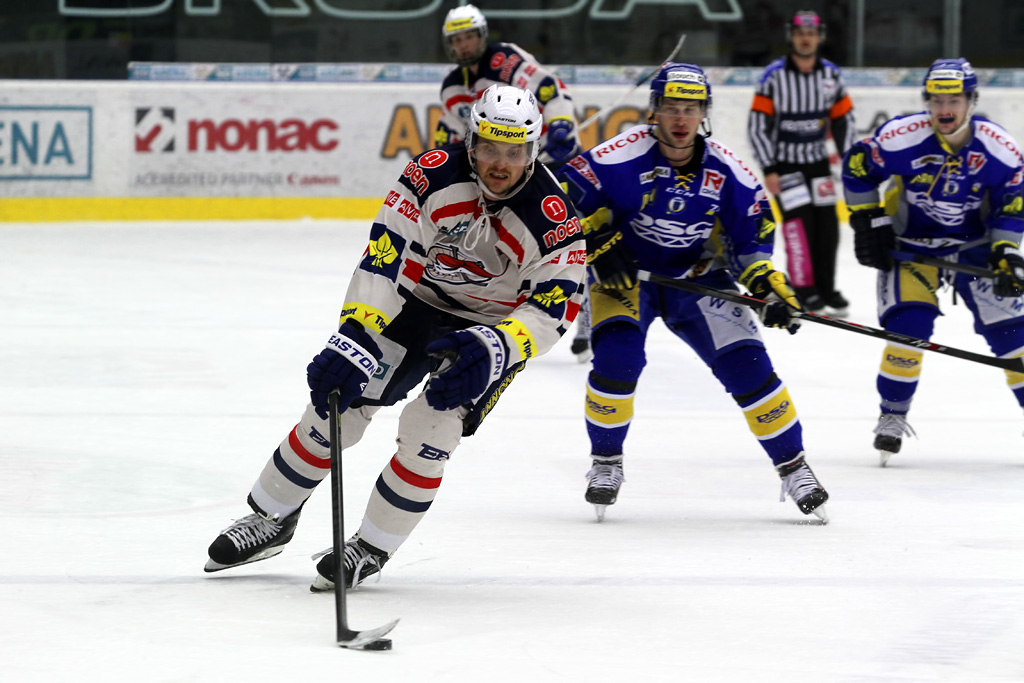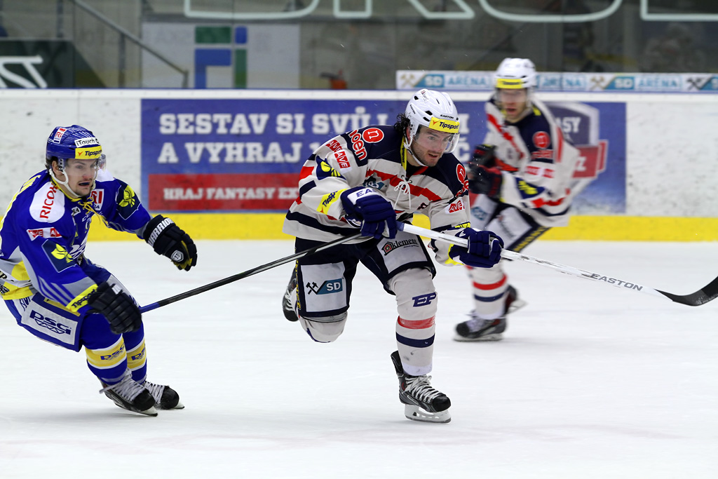 Nikola Gajovský se snaží prohodit puk za bránícího hráče