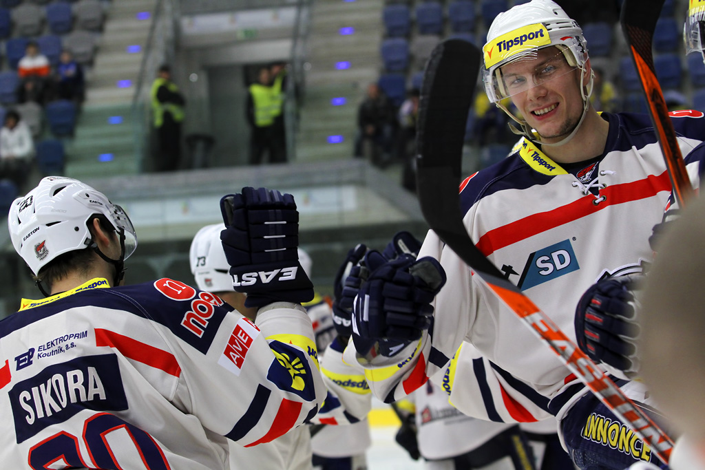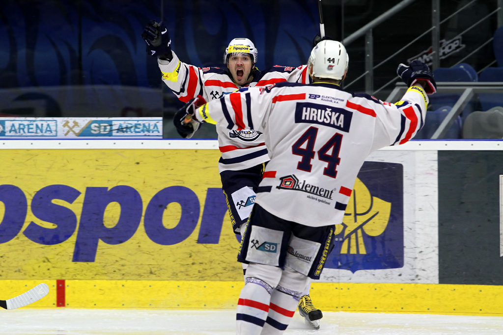 ...důrazný Marek Sikora se raduje ze svého prvního gólu v sezoně, prvním gratulantem byl David Hruška