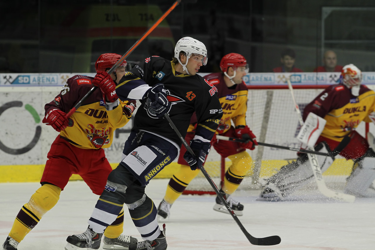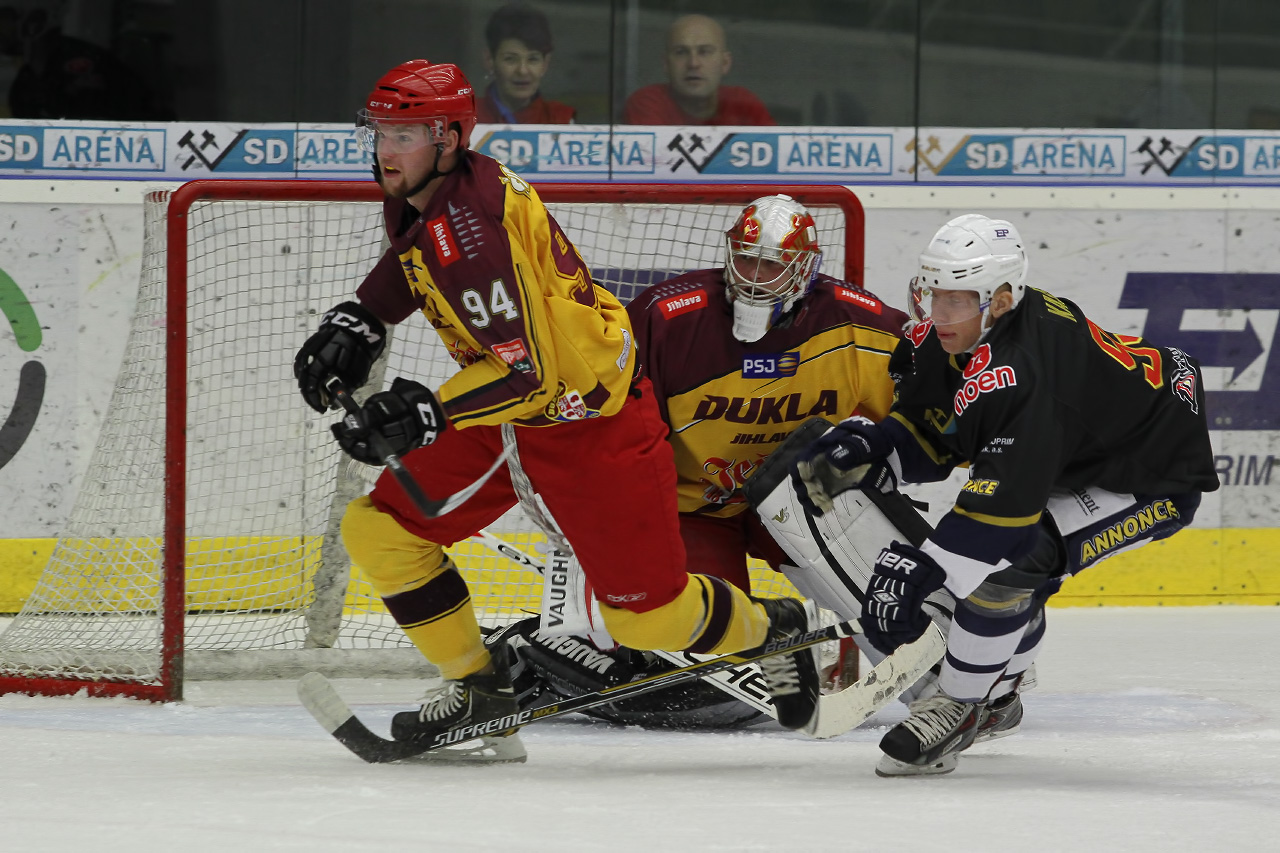 Ondřej Kaše se srdnatě bije před brankou jihlavské Dukly