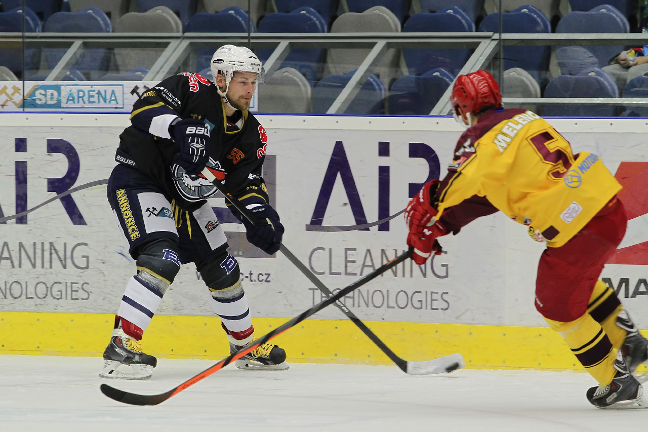 Štěpán Hřebejk postupuje vpřed na obranné modré čáře jej atakuje Ondřej Malec