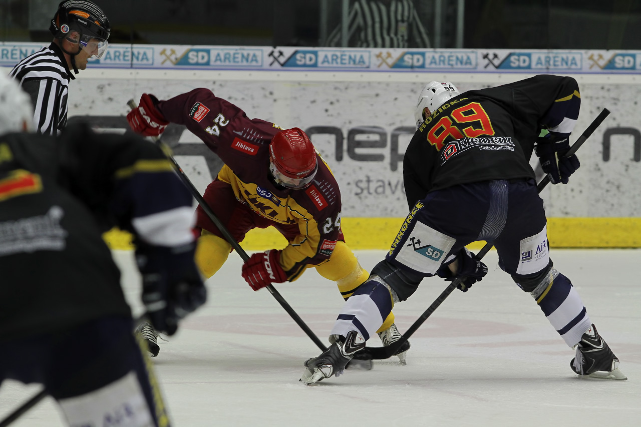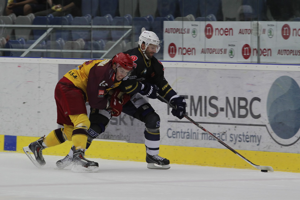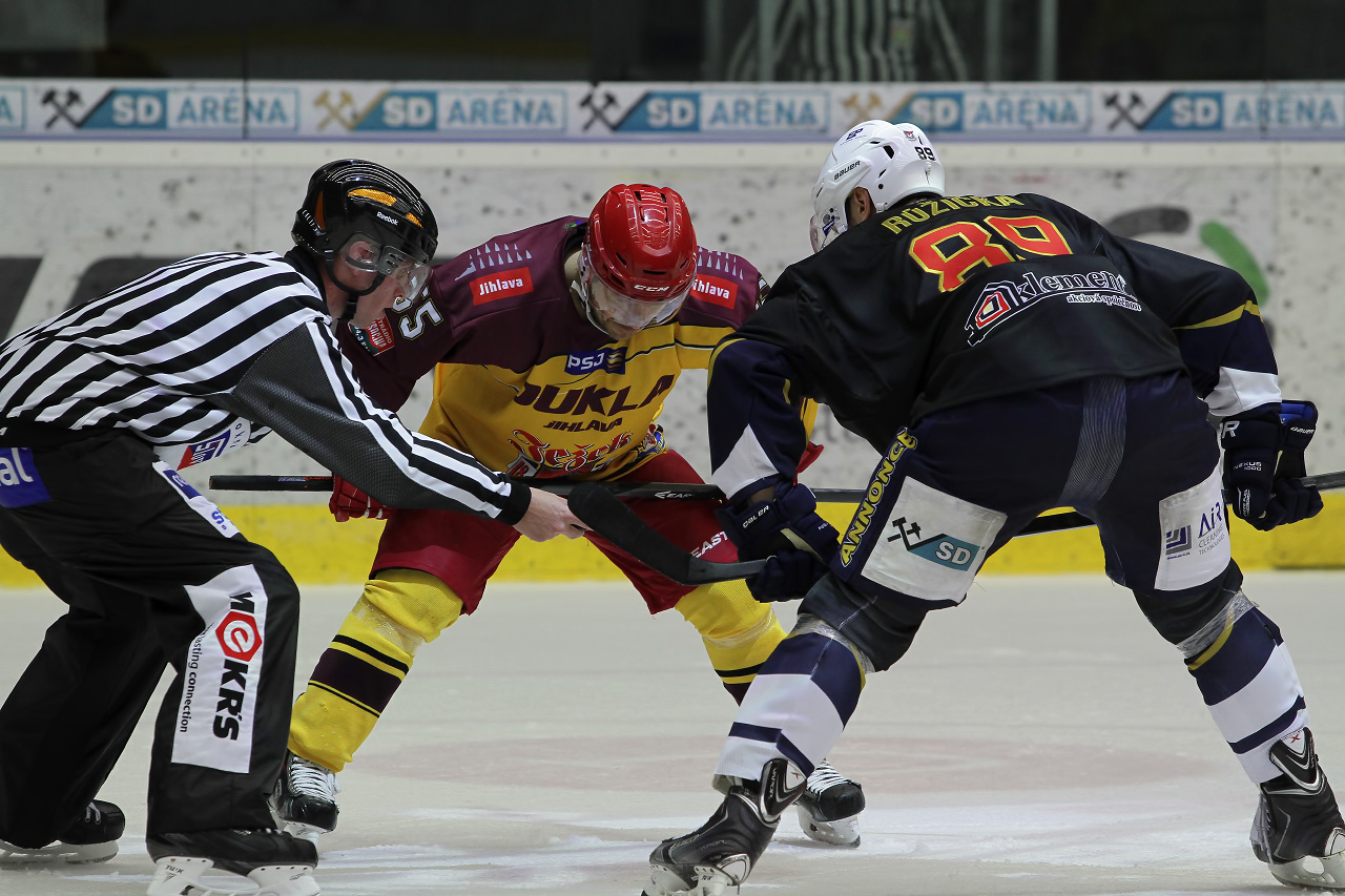 Antonín Dušek se ohlíží za sebe, kde se pohybuje kotouč, to samé dělá také jihlavský Michal Důras