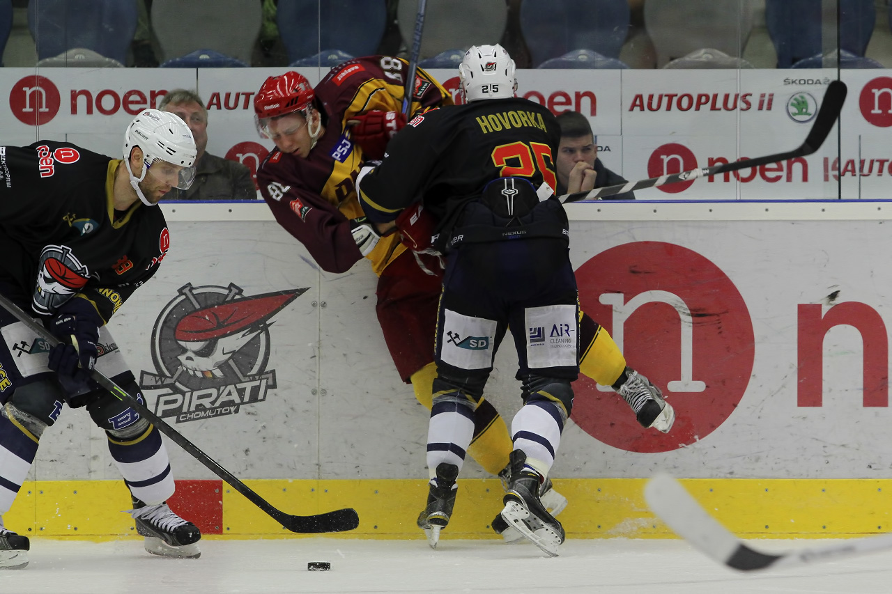 Michal Důras operuje před Miroslavem Hanuljakem, pirátský kapitán Jiří Drtina sleduje hru ve vlastním obranném pásmu