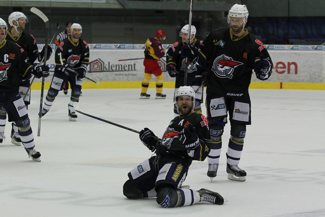 Marek Hovorka se raduje z vyrovnání na 3:3 v čase 56:49. Jako první se k němu dostává Brett Skinner