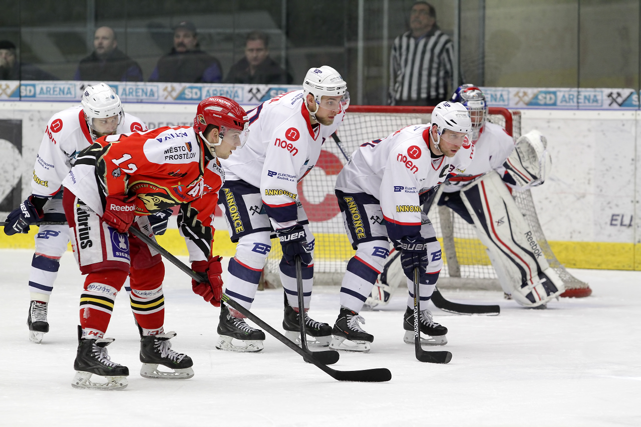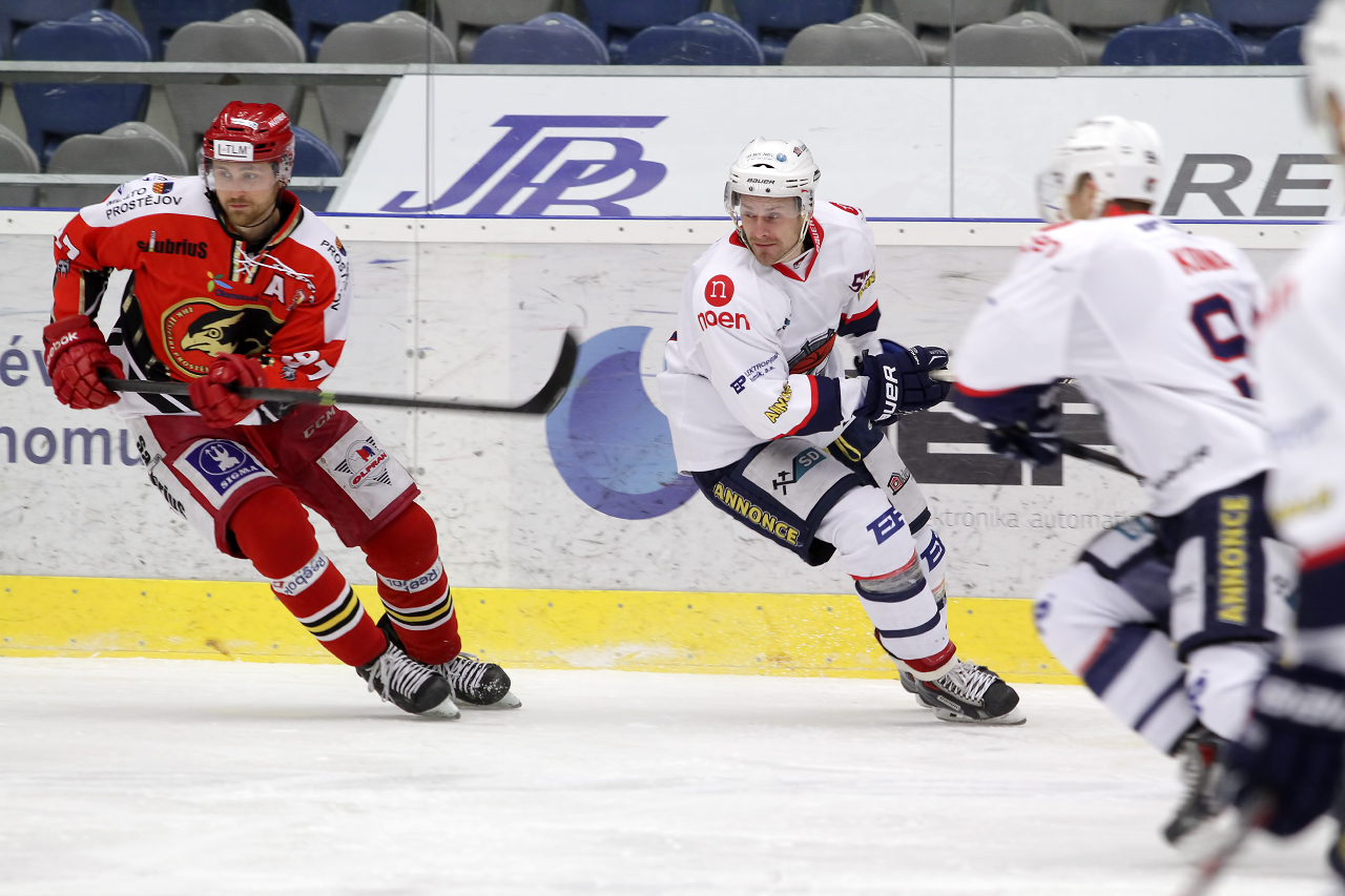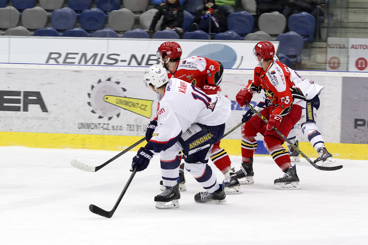Jakub Stehlík (bez helmy) měl ve třetím dějství drobnou rozmíšku s obráncem Davidem Roupcem, nejproduktivnějším hráčem Prostějova