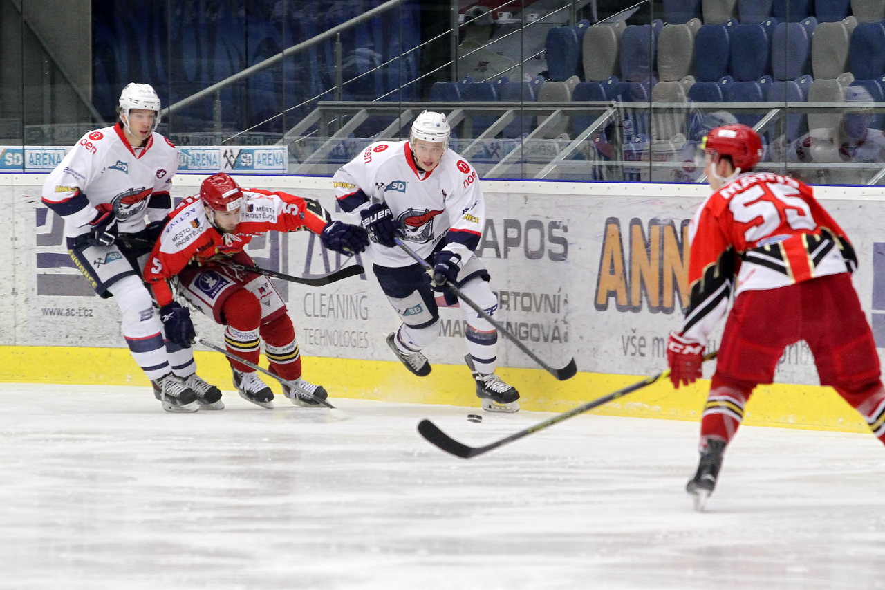 Lukáš Květoň se ohlíží za pukem, který sleduje také hostující Matouš Venkrbec. Napadat vyráží také Jaroslav Koma