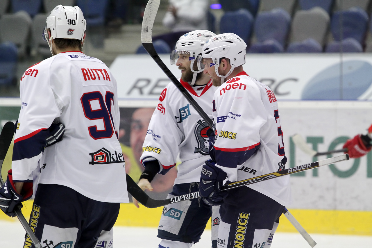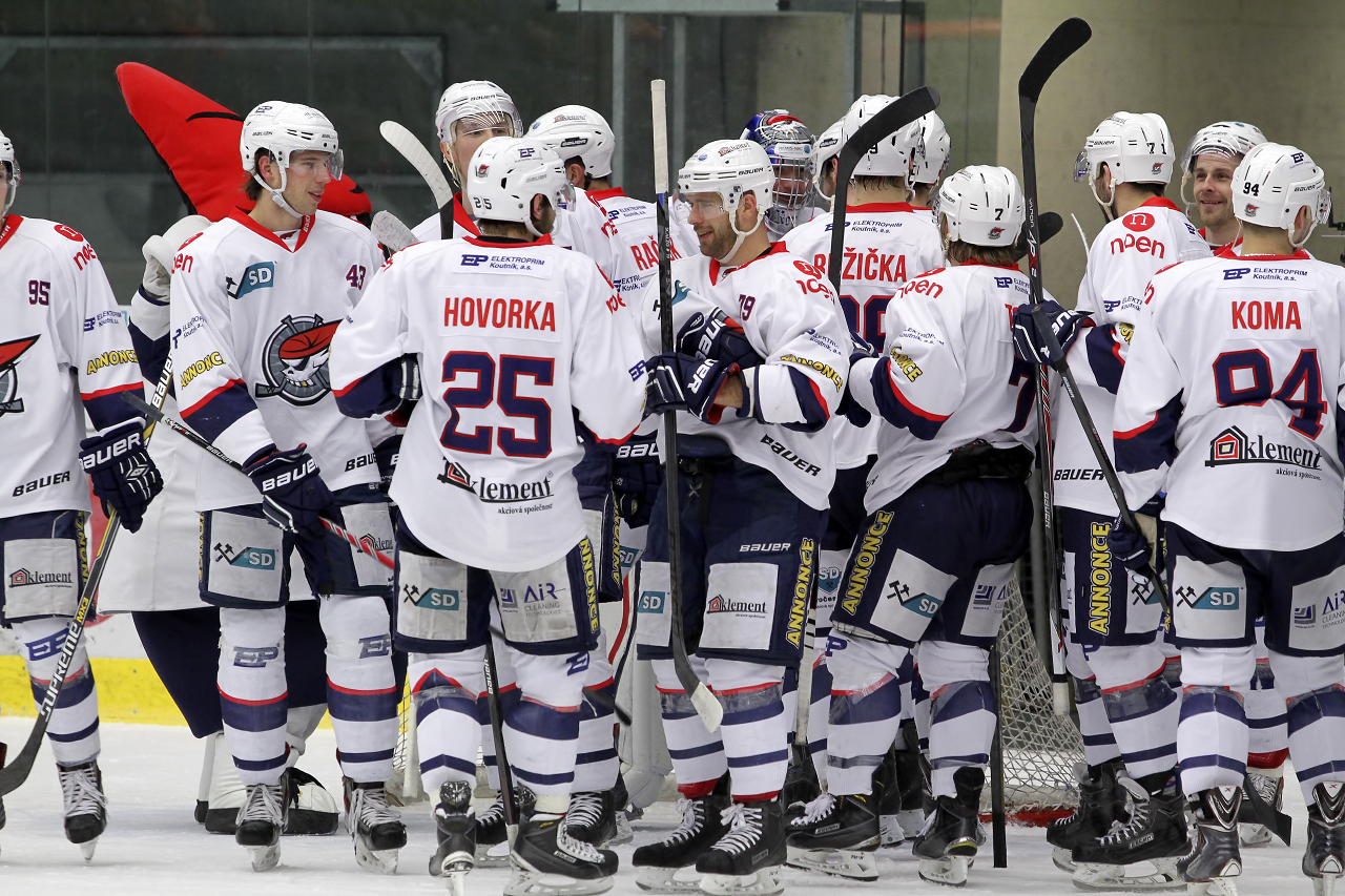 Úsilí se vyplatilo, Piráti právě vstřelili šestý gól, který obstaral Roman Chlouba . Gratulují mu spoluhráči Jaroslav Koma, Vladimír Růžička, Brett Skinner a Lukáš Květoň