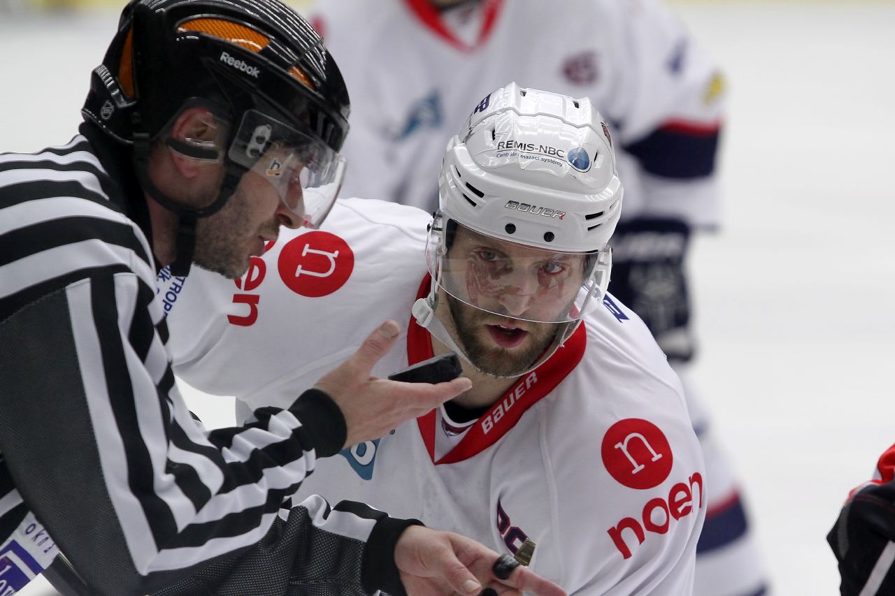 David Kämpf sleduje přechod Ondřeje Kaše přes útočnou modrou čáru, aby nepřejel dřív a nezpůsobil postavení mimo hru