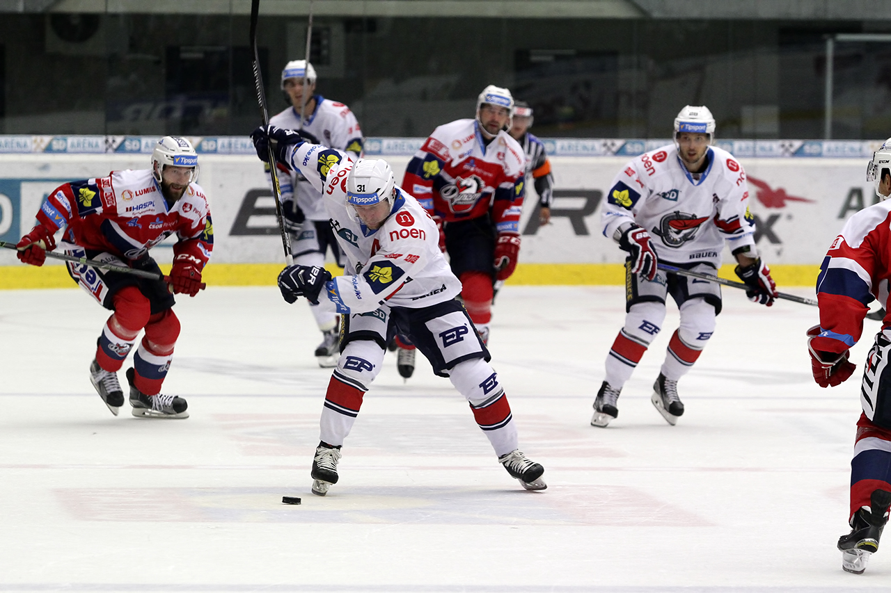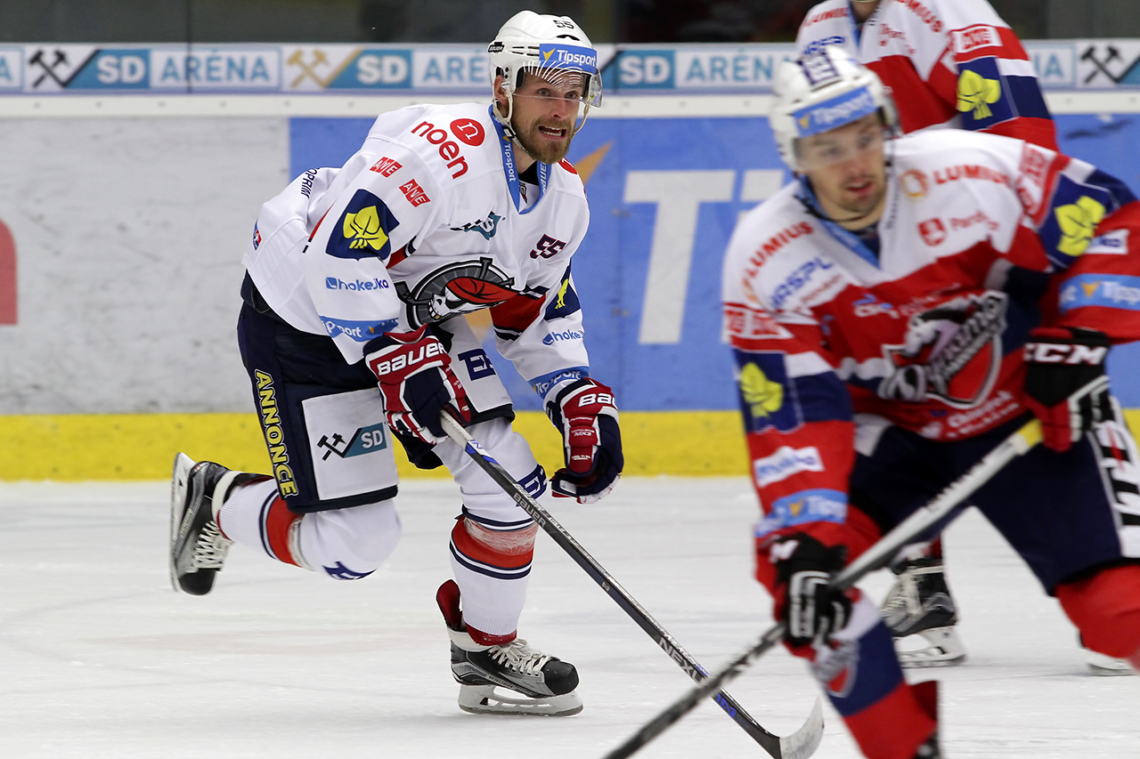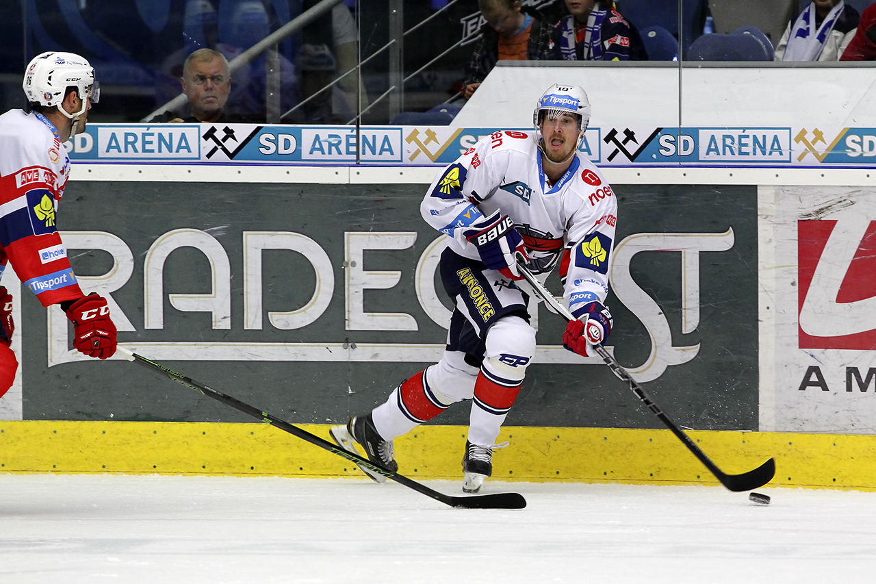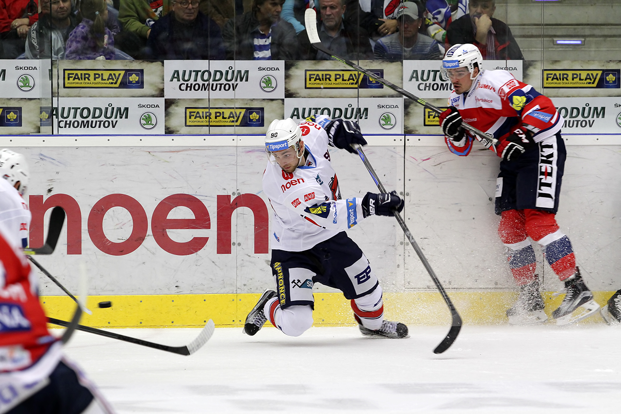 Hrdina předchozího domácího duelu a Mladou Boleslaví Jakub Sklenář bojuje o puk