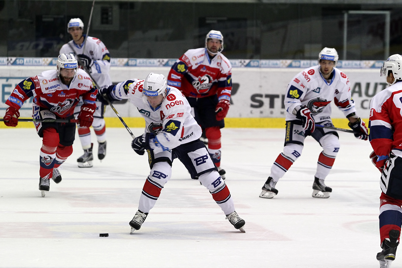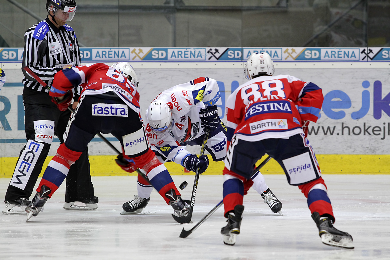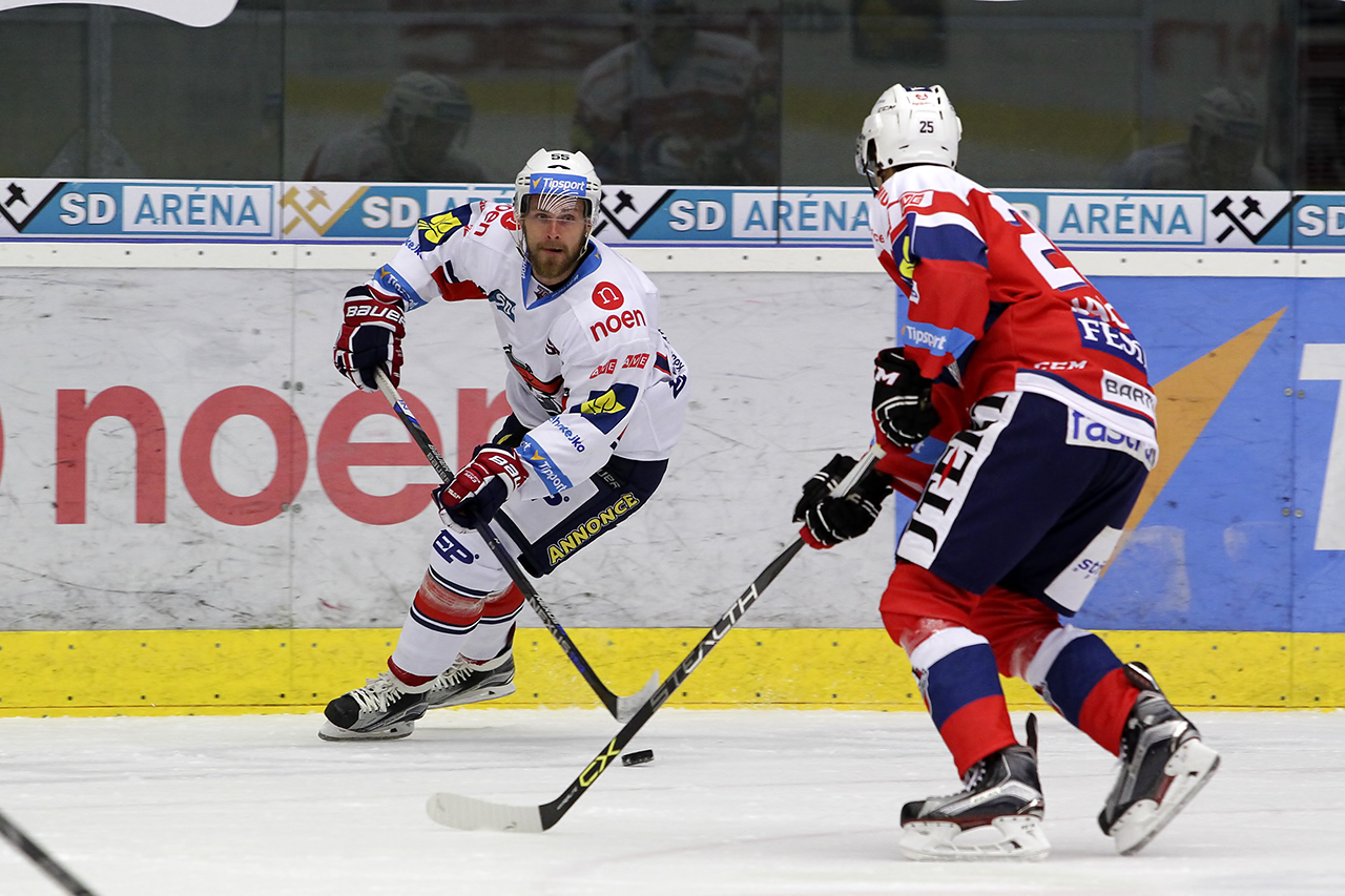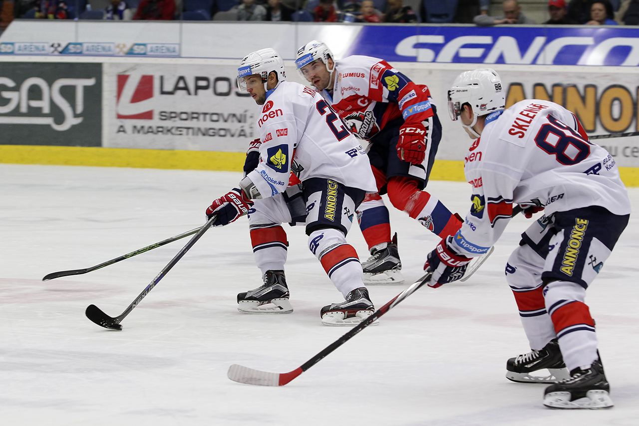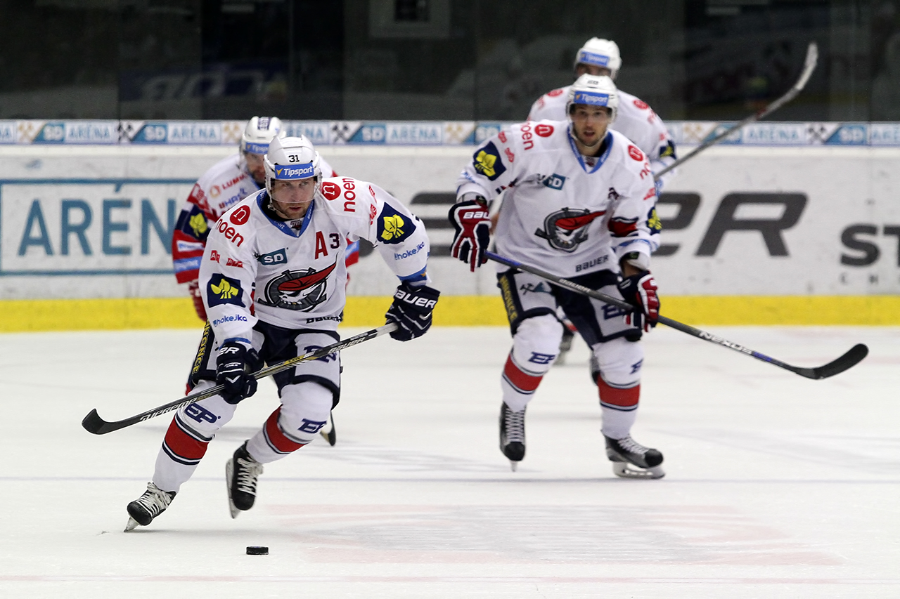 Hrdina předchozího domácího duelu a Mladou Boleslaví Jakub Sklenář bojuje o puk