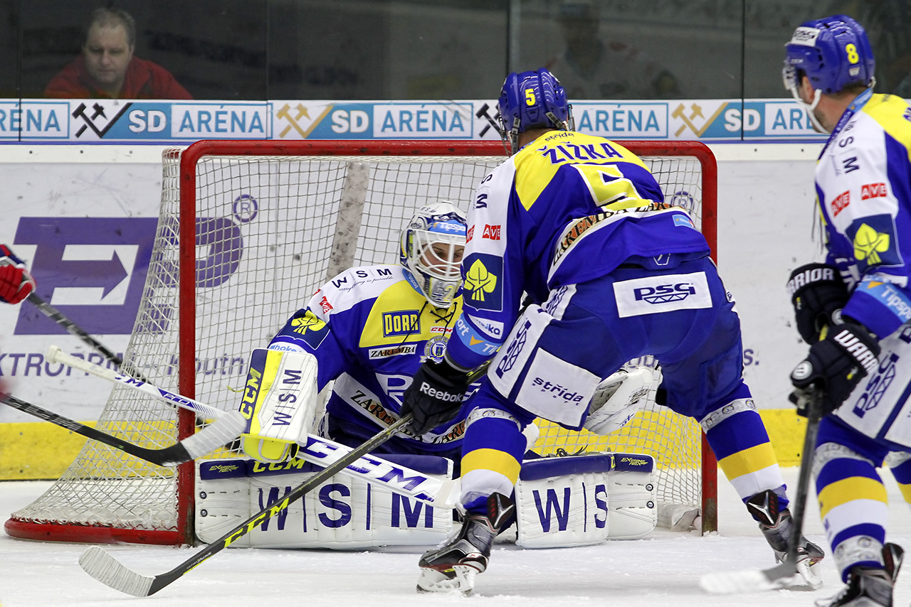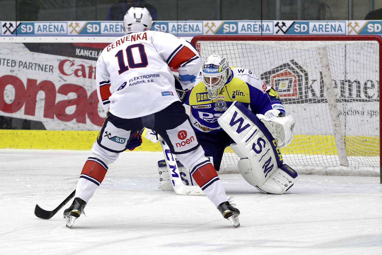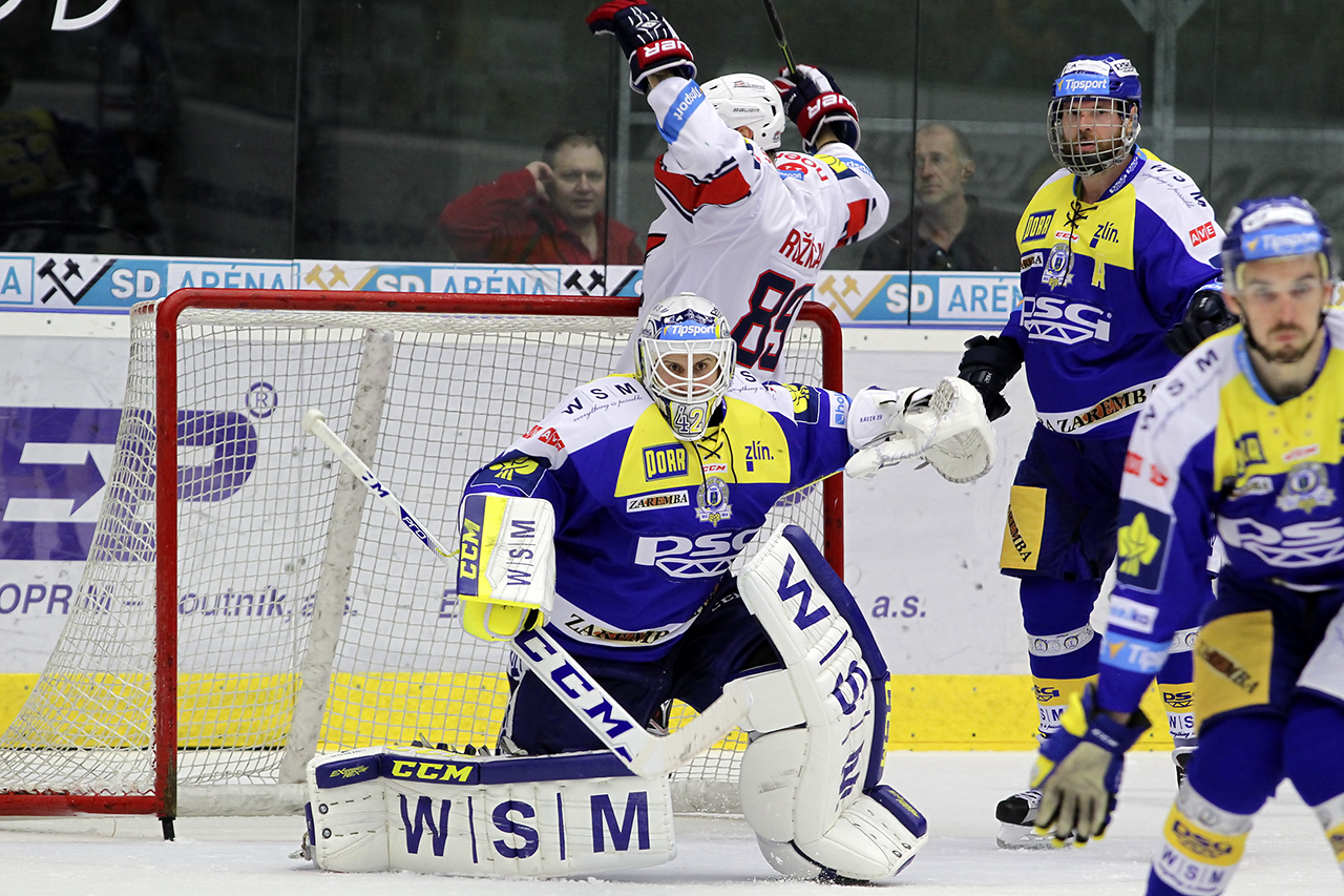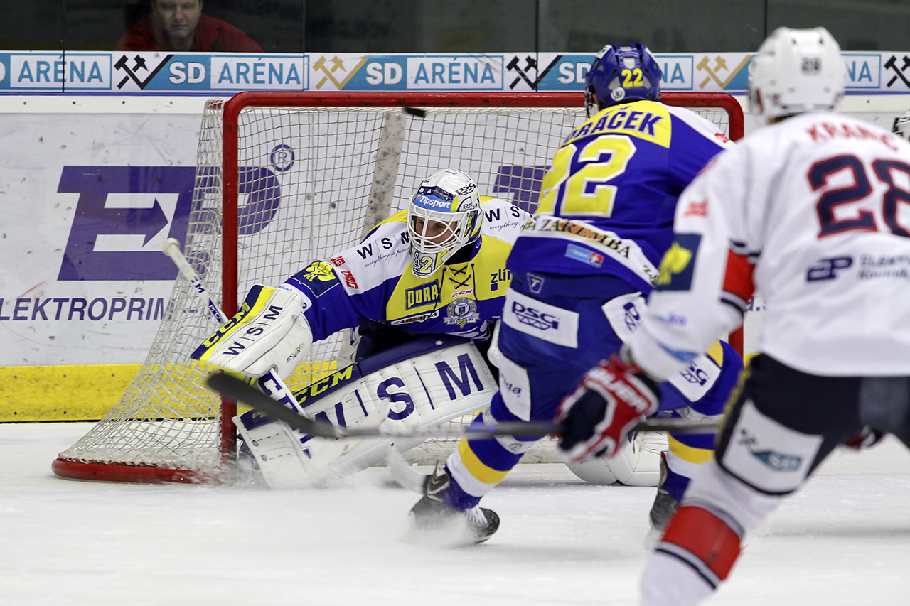 ...zlínský brankář i přes clonu Vladimíra Růžičky mladší střelu od modré chytil
