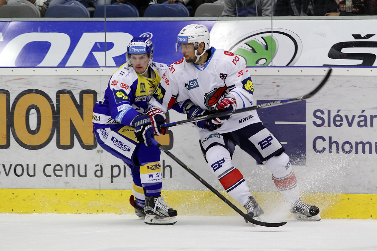 Štěpán Hřebejk přihrává přes hokejku zlínského kapitána Ondřeje Veselého
