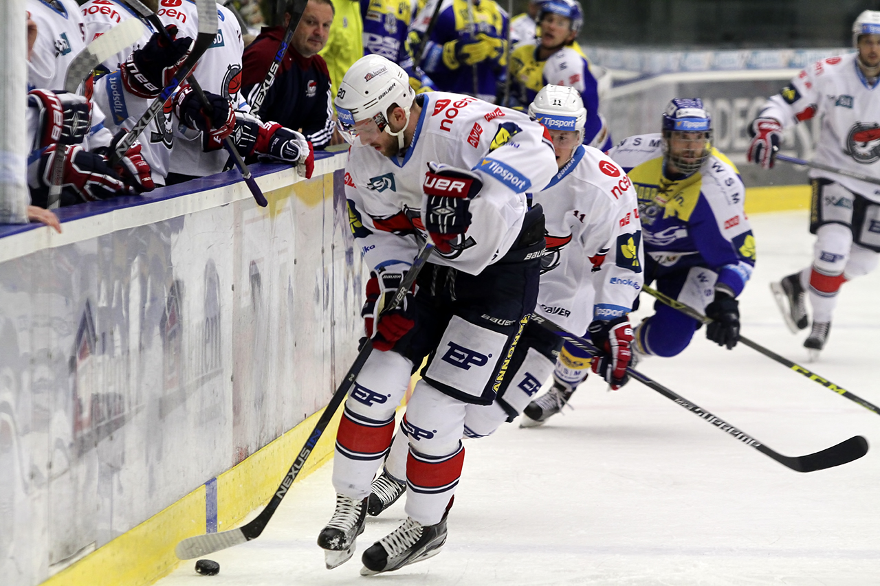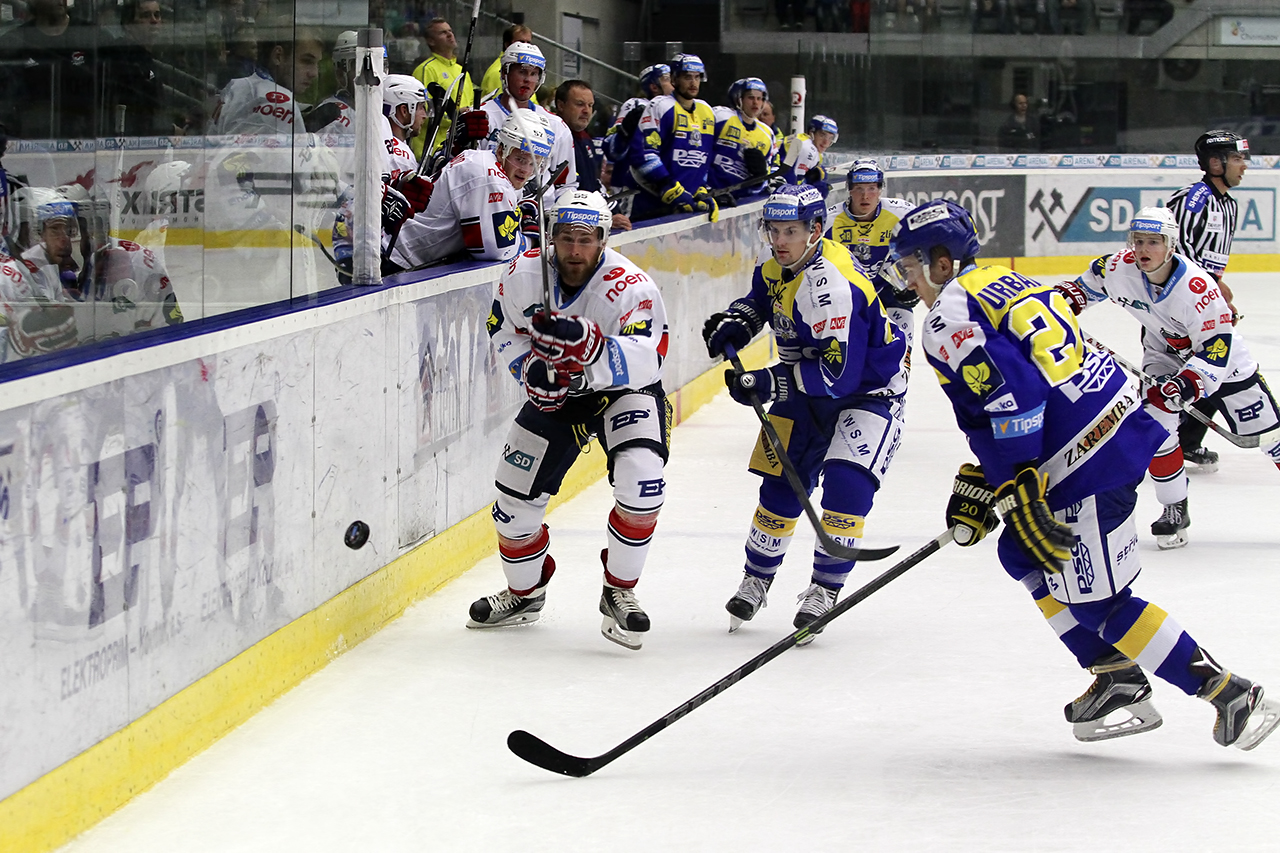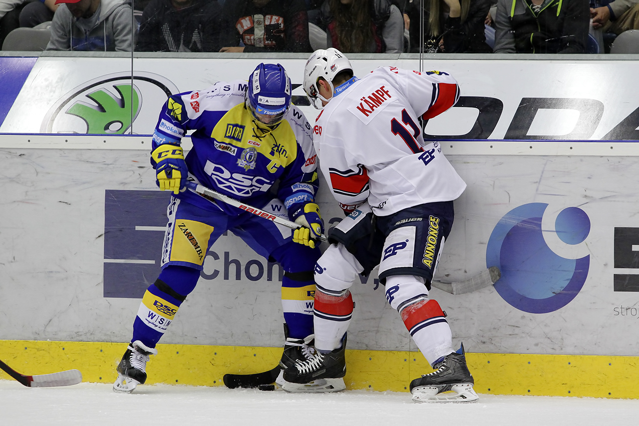 David Kämpf se přetlačuje o puk se soupeřem u mantinelu