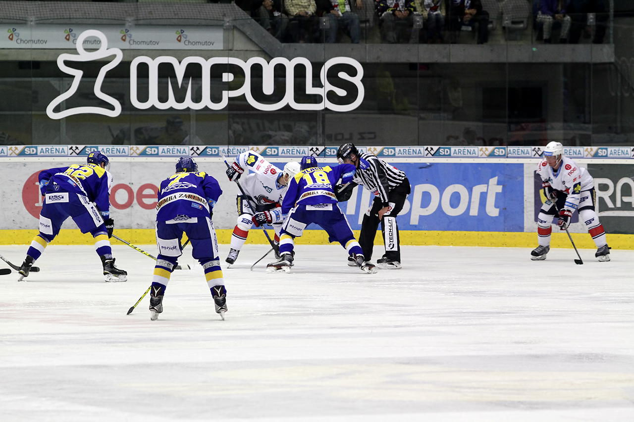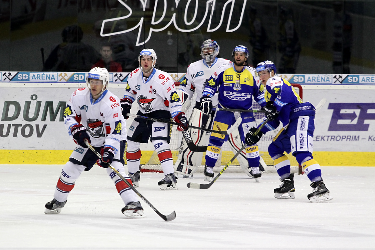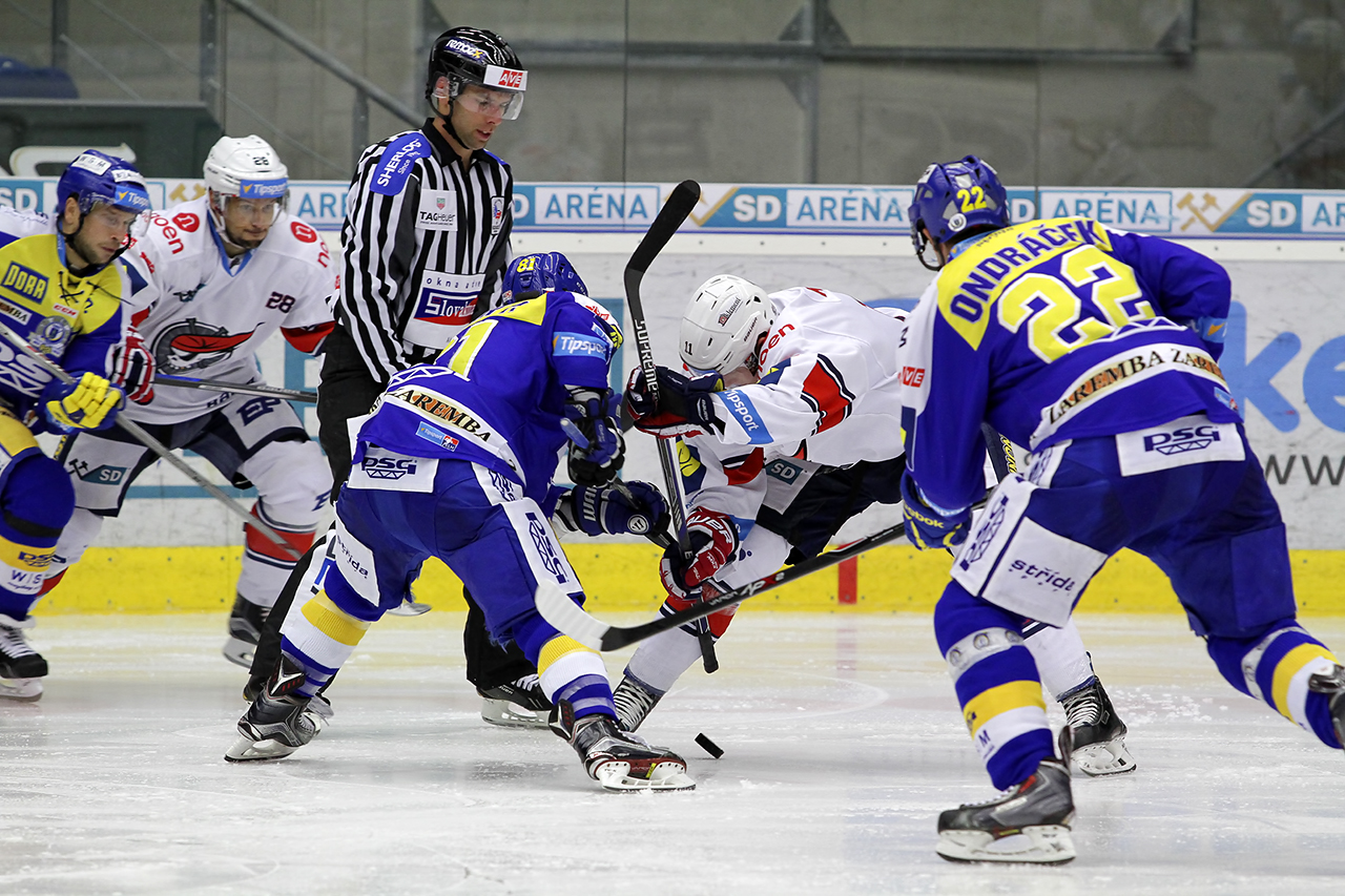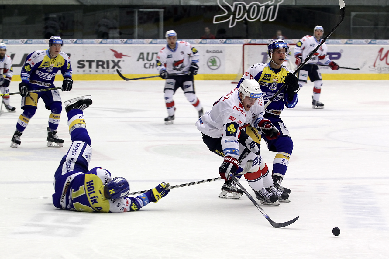 David Kämpf bojuje na buly o puk s Petrem Holíkem, v pozadí vyráží do mlýnice Aleš Kranjc s Ondřejem Veselým