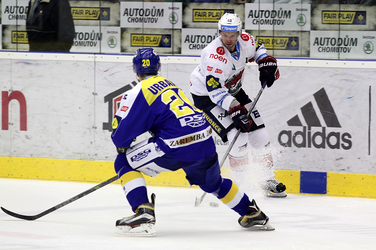 Tomáš Pospíšil si stráží puk před dotírajícím Daliborem Řezníčkem