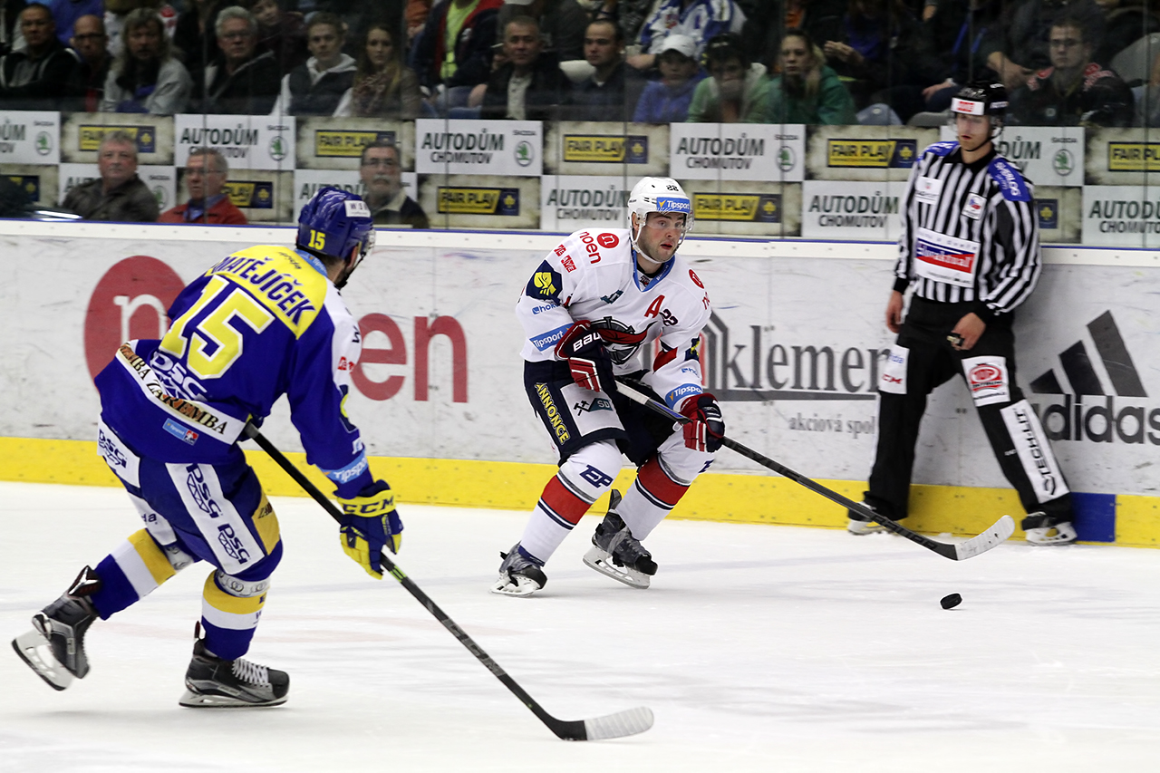 Michal Vondrka postupuje do útočného pásma, Martin Cibák se na modré obrací zpět do defenzivy