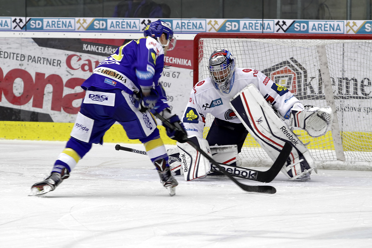 Miroslav Kopřiva chytá nájezd Petra Holíka v rozstřelu po skončení prodloužení