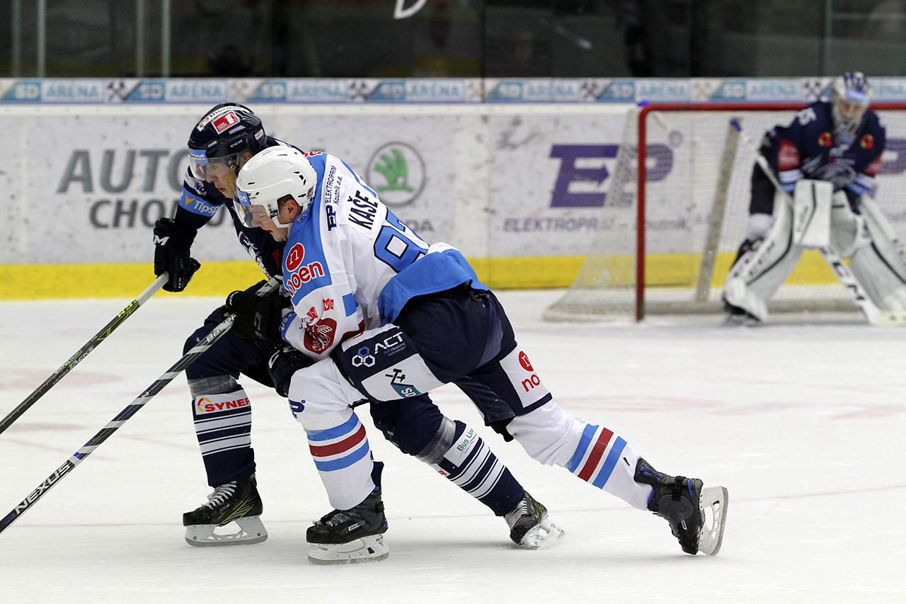 Petr Koblasa si u zadního mantinelu kryje kotouč před Michalem Plutnarem