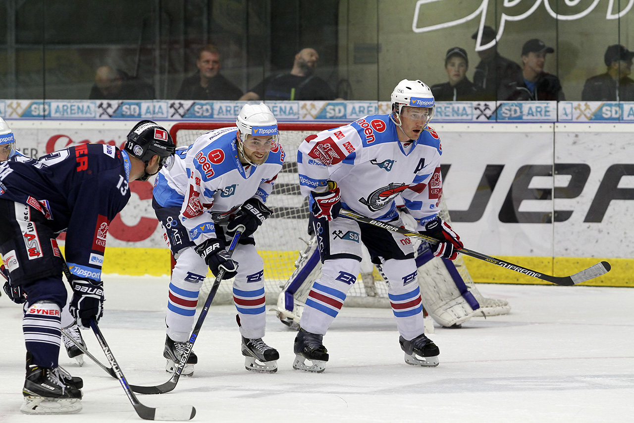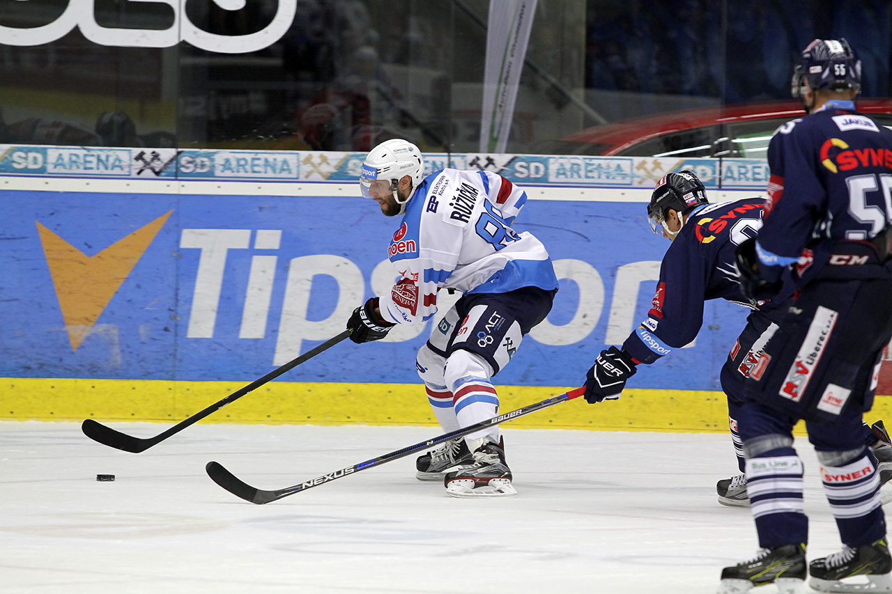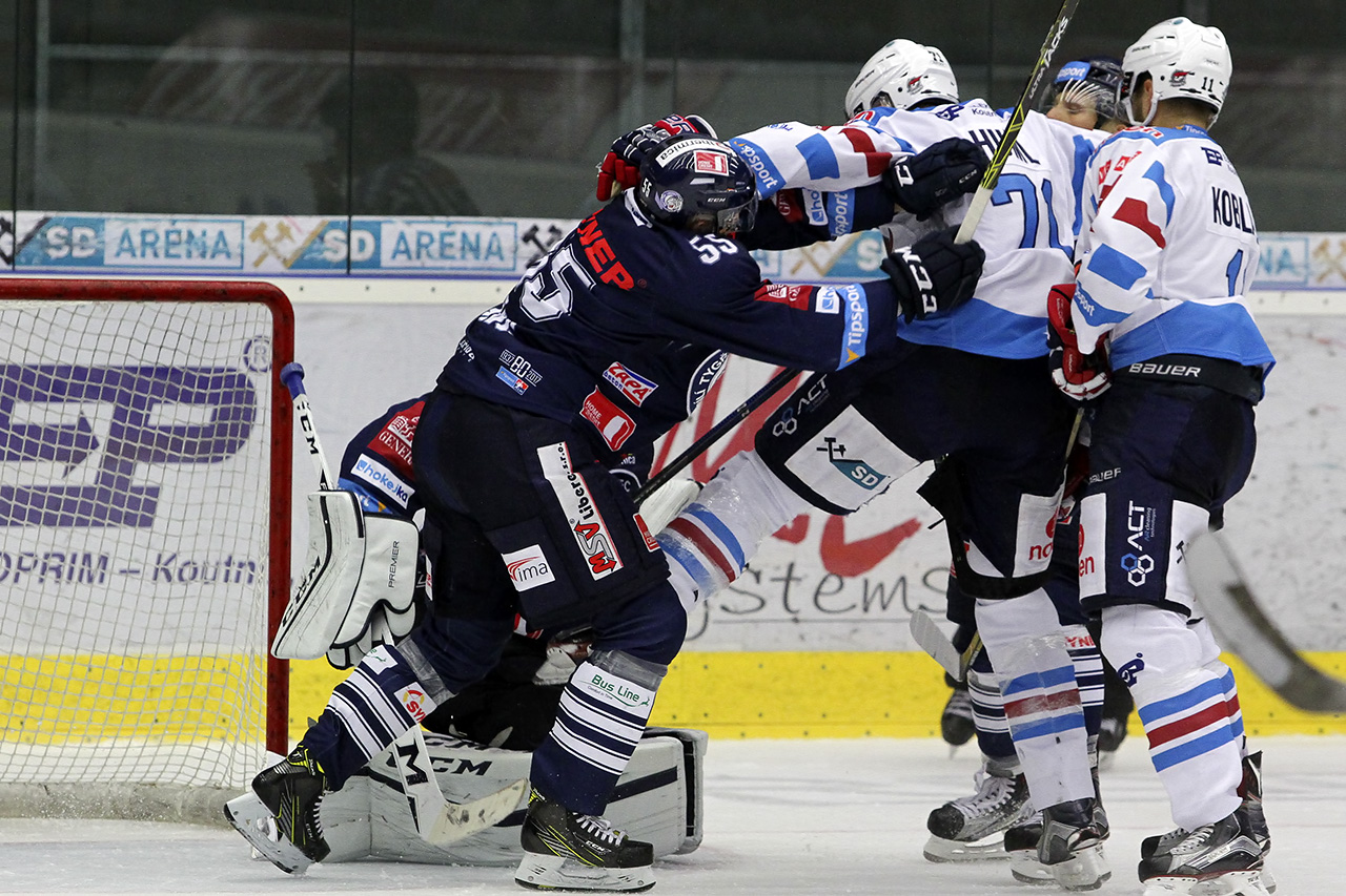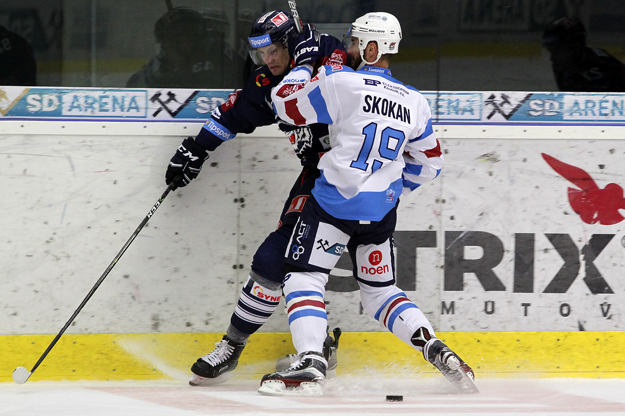 Petr Koblasa vyjíždí s pukem od mantinelu, kde přetlačil Mária Bližňáka (č. 87)