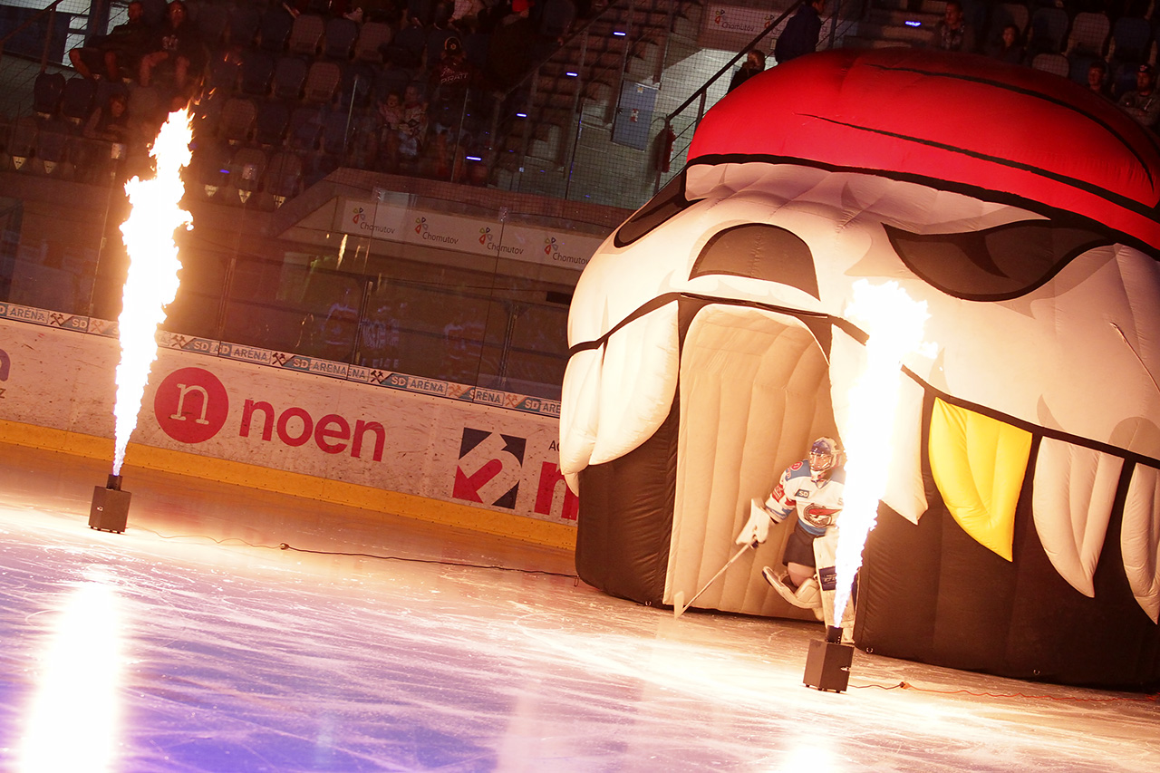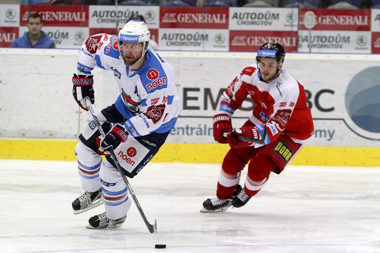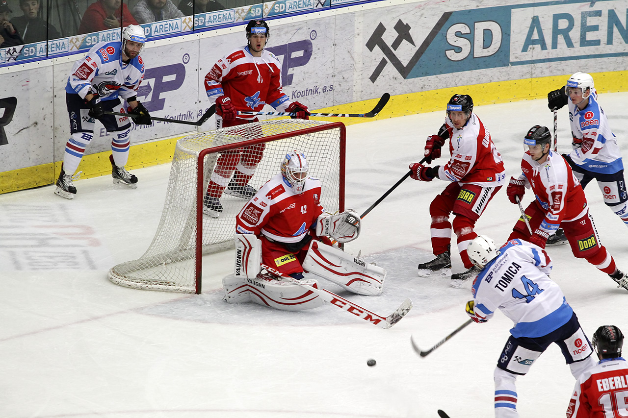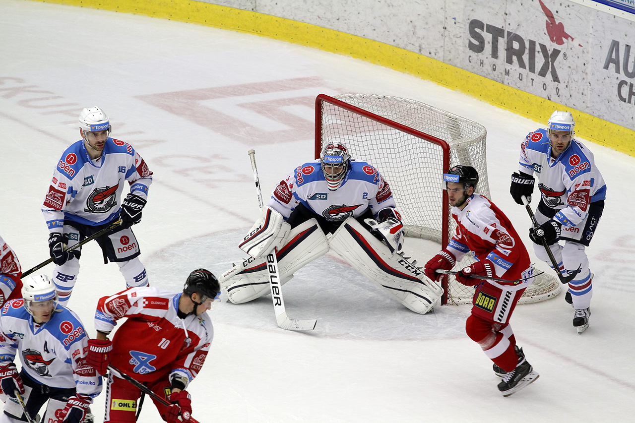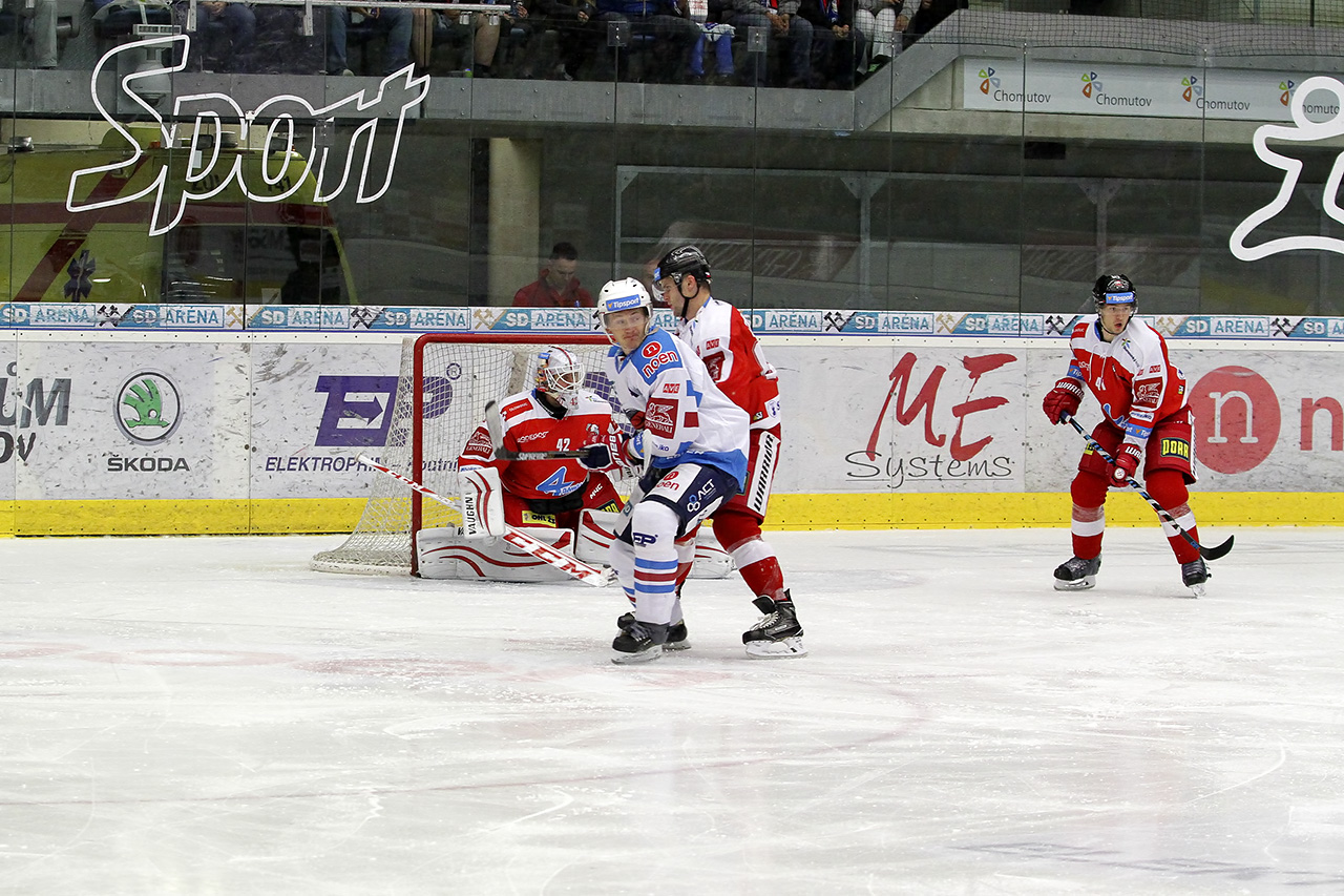 Olomouc právě počtvrté překonala chomutovského brankáře, Jan Knotek v přesilovce protlačil puk za Jana Strmeně