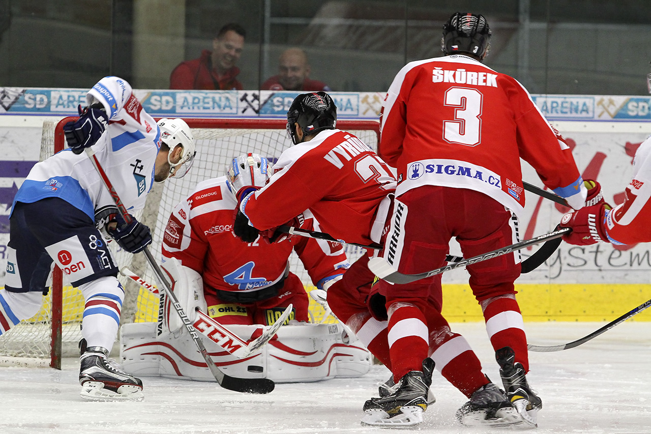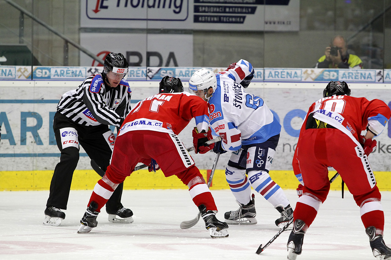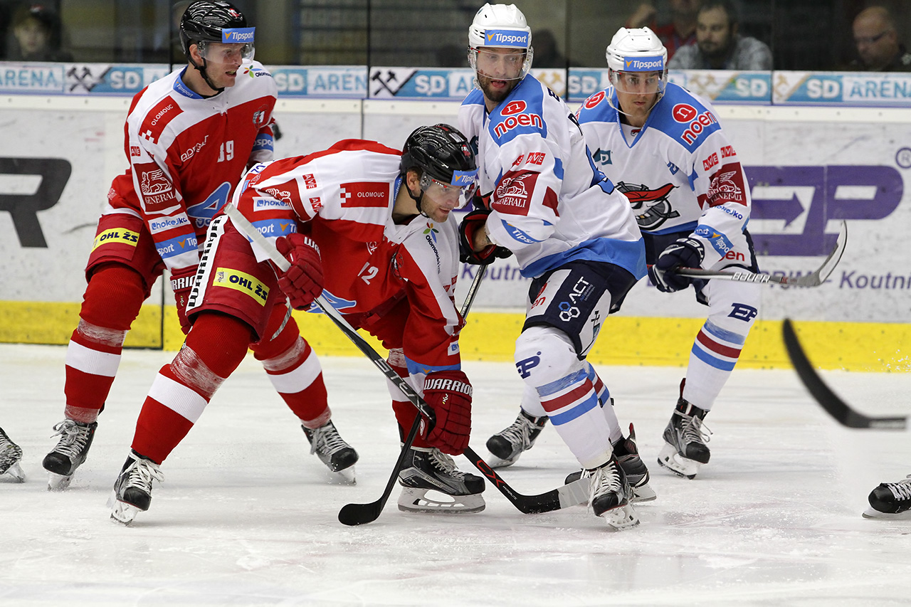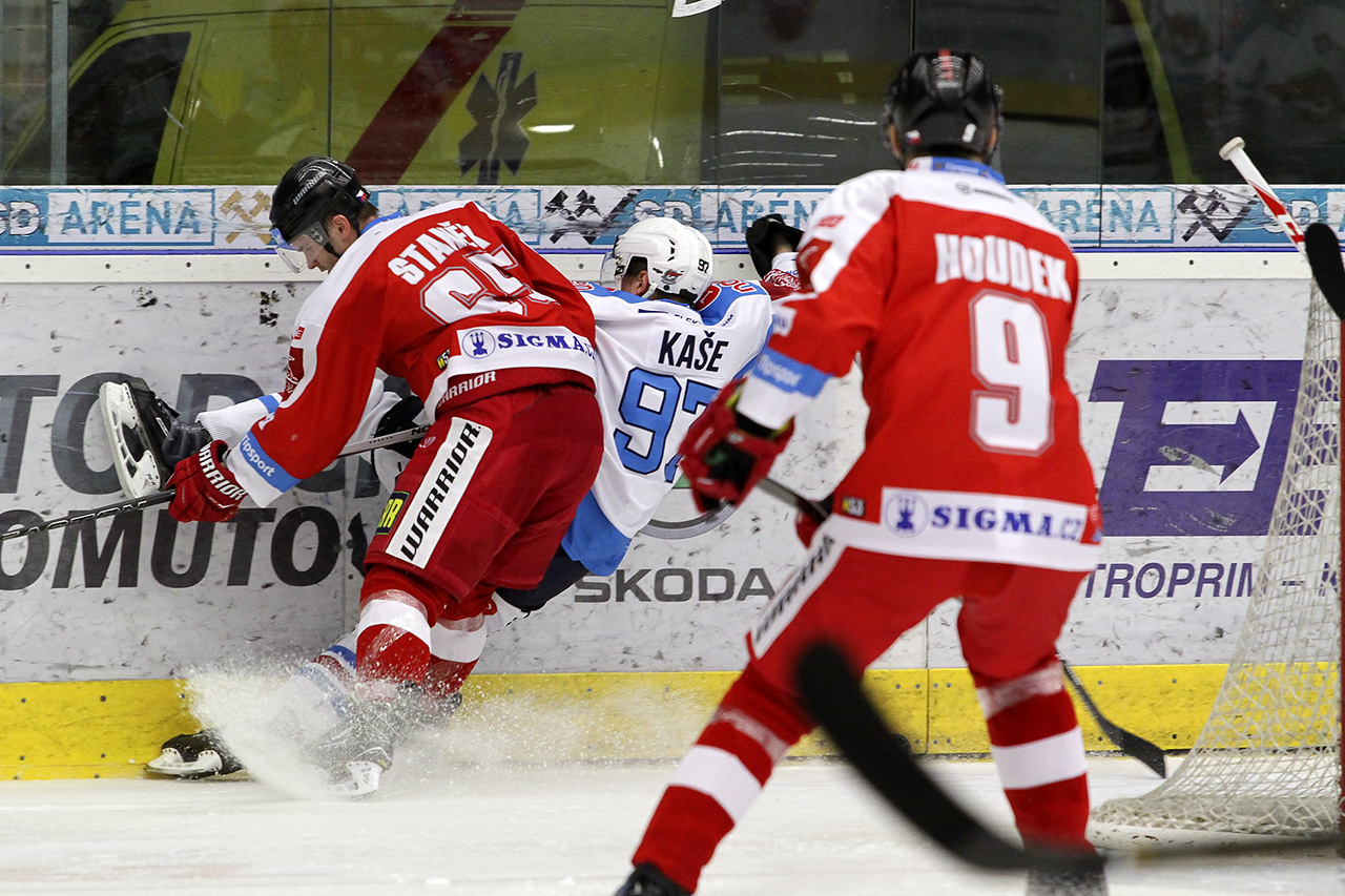 David Kaše hlídá před Janem Strmeněm olomouckého útočníka Viléma Buriana