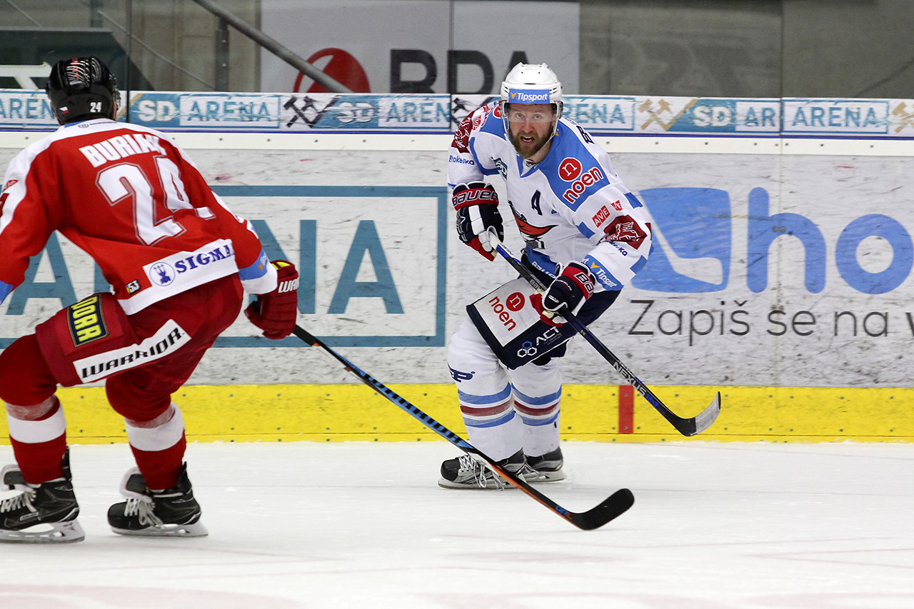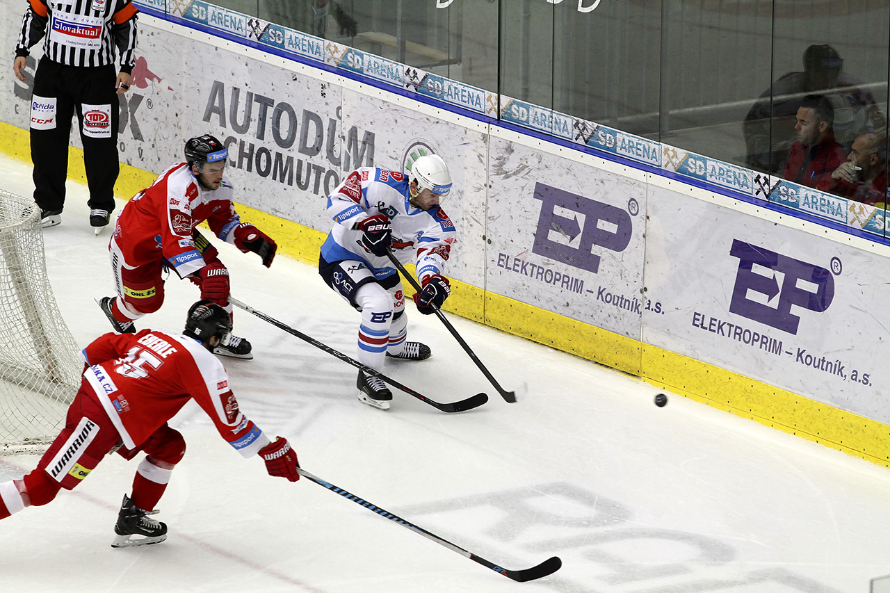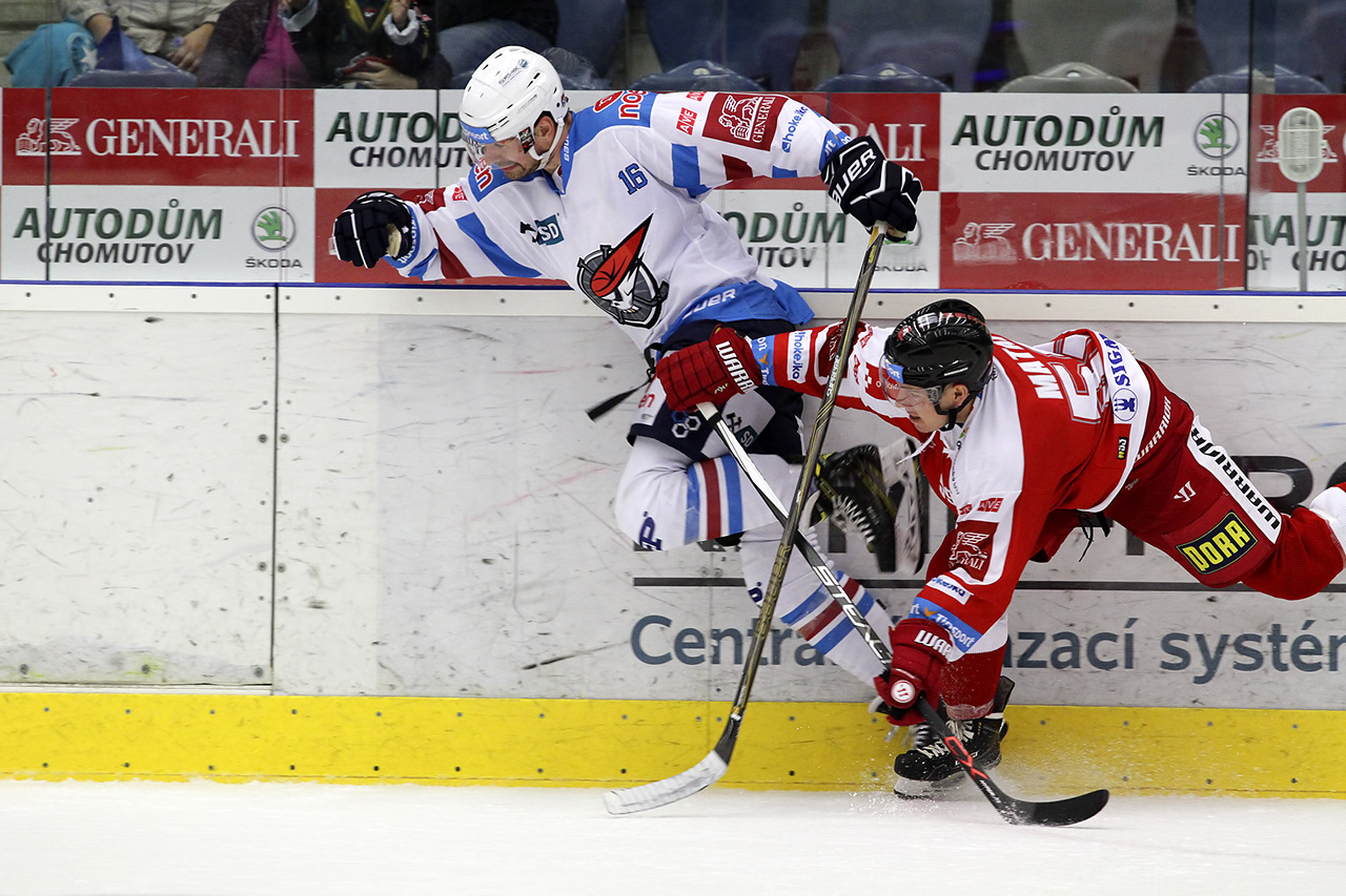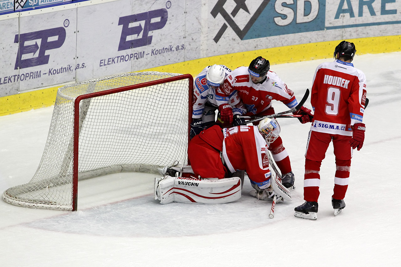 David Kaše hlídá před Janem Strmeněm olomouckého útočníka Viléma Buriana