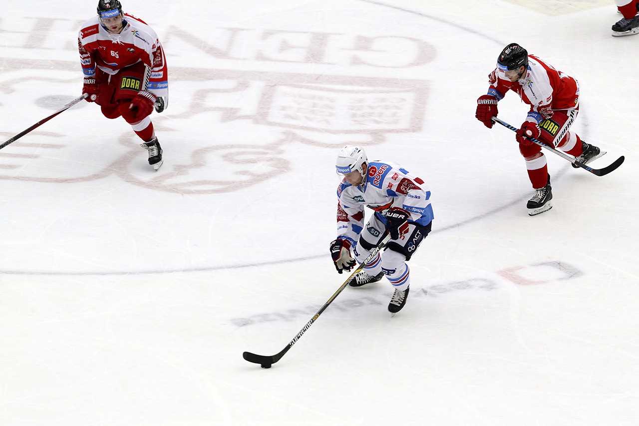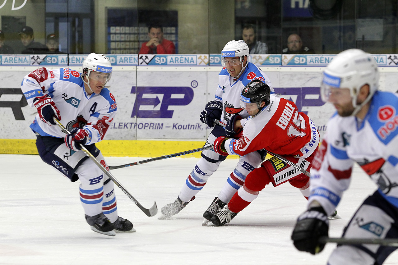 Brett Skinner odpaluje kotouč z vlastního obranného pásma před dotírajícím Janem Eberlem a Jakubem Hermanem